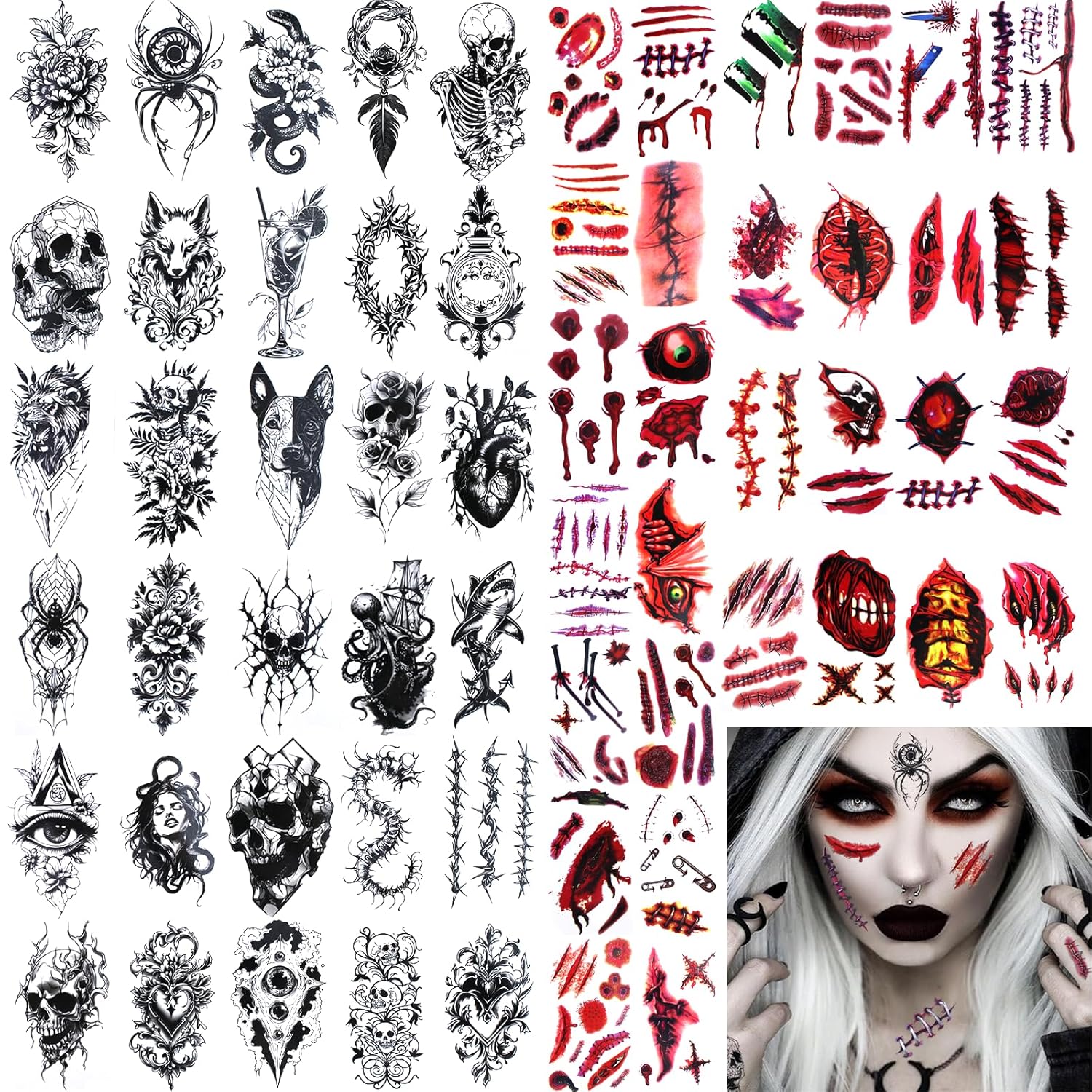 60 Sheets Halloween Tattoo Stickers, Zombie Makeup Fake Scars Stitch Temporary Tattoos Fake Wounds Blood Scar Sheets for Face Halloween Costume Cosplay