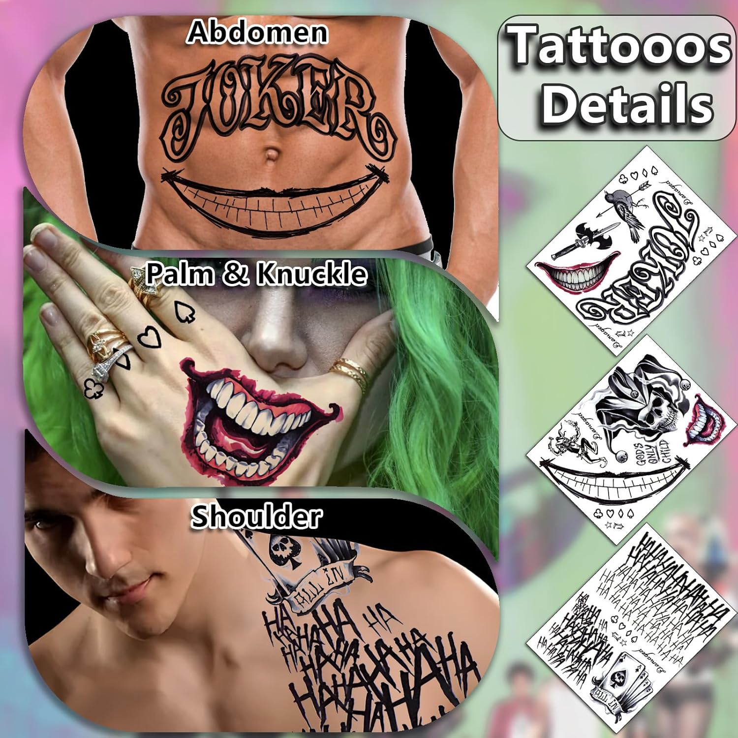 Joker Tattoo & Scary Mouth Set: 3 Joker+15 Mouth+20 Scars. Halloween Face & Body Temporary Tattoos