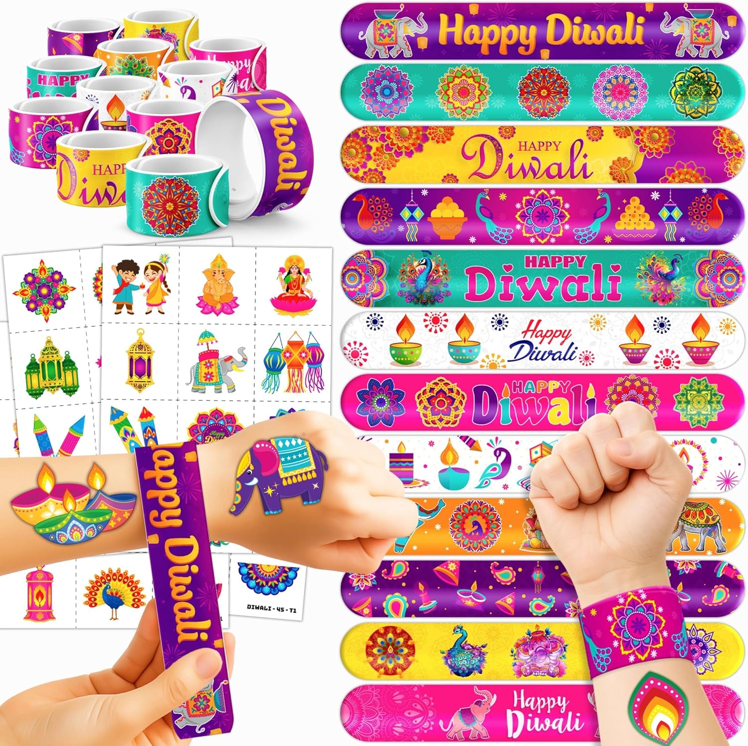 72PCS Diwali Party Set - 48PCS Temporary Tattoos & 24PCS Slap Bracelets - Festival Happy Indian -Themed Birthday Supplies, Baby Shower Gifts, Classroom Rewards & Party Decor for Kids