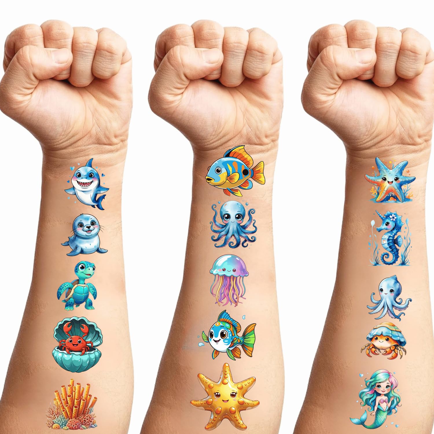 108 PCS Ocean Sea Animal Shark Whale Fish Pre-Cut Temporary Tattoos for Kids | Super Cute Themed Birthday Party Favors, Supplies, Decorations, Fake Tattoo Stickers