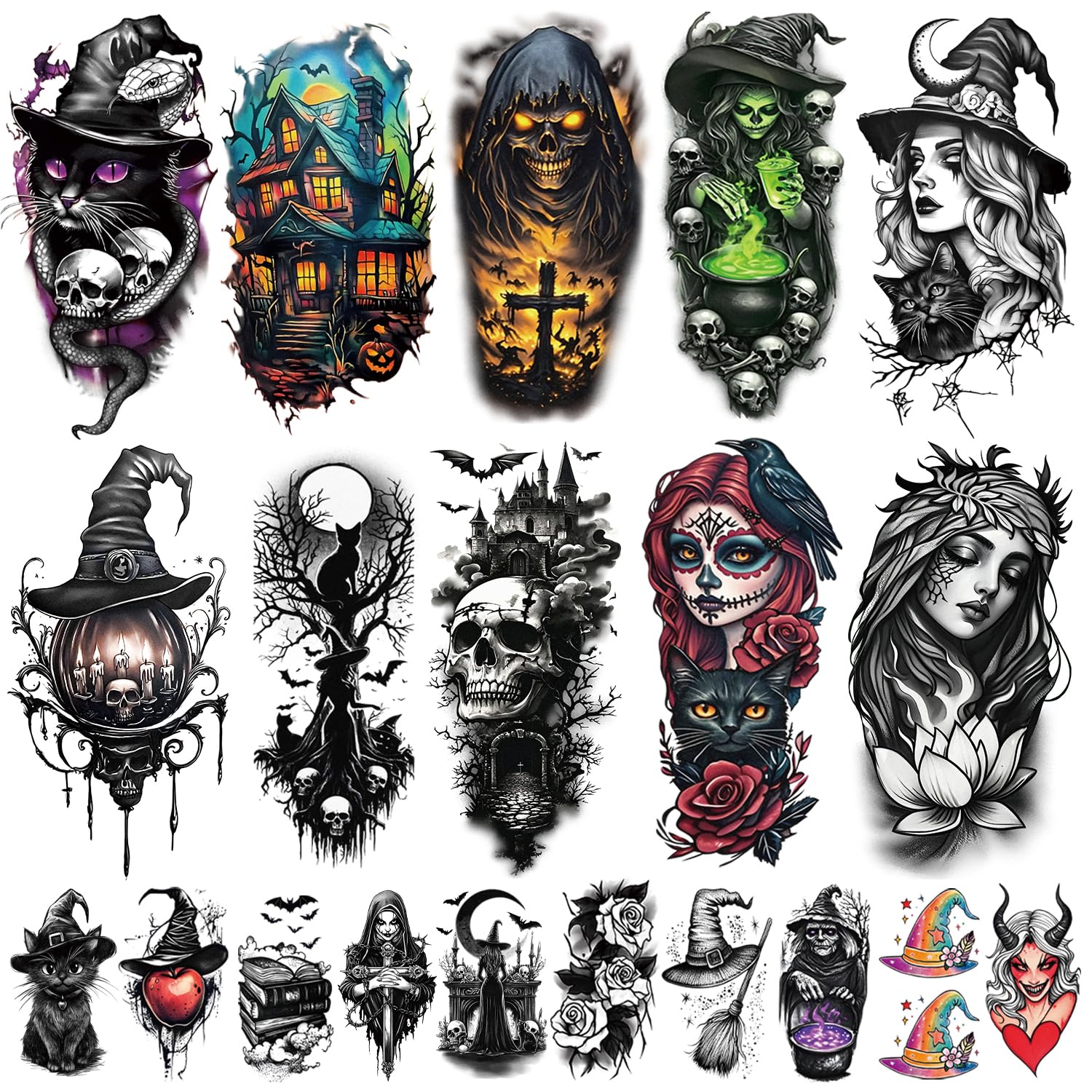 39PCS Glow in The Dark Halloween Tattoos, Witch Makeup Kit, Pumpkin Bat Skull Spider Cat Ghost Realistic Eye Shadow Eye tattoo Fake Tattoos for Adult Kids