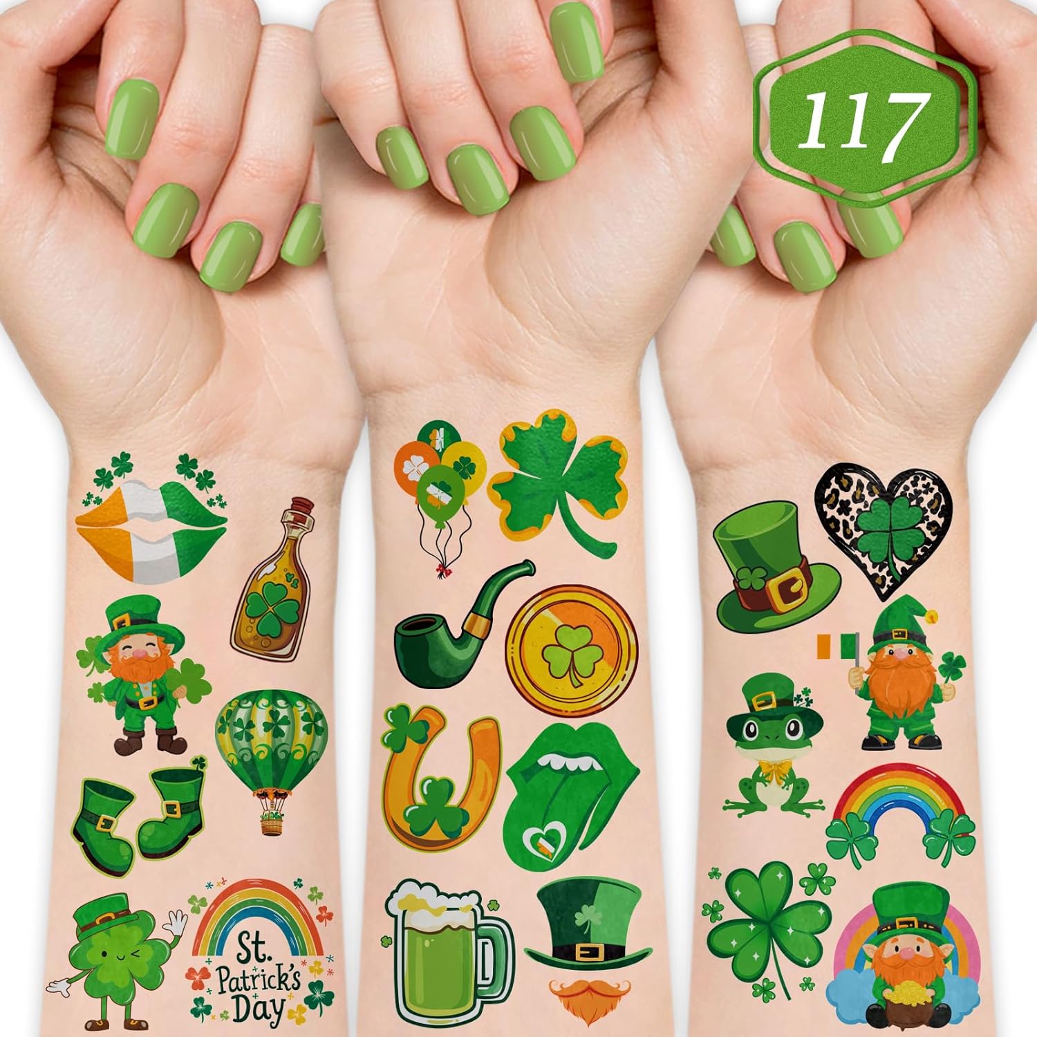 117 PCS St Patricks Day Temporary Tattoos St. Patrick's Day Shamrock Face Stickers Shamrock Tattoos Irish Party Favor Accessories, Saint Patricks Day Fake Tattoo Lucky Green Four Leaf Clover Decals