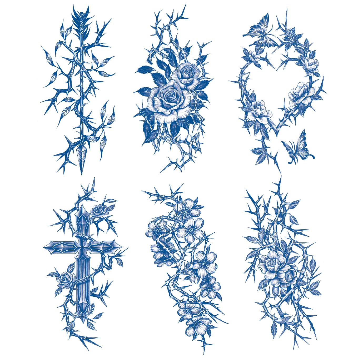 Semi Permanent Tattoos - Pack of 6, Waterproof Temporary Tattoos for Women - Fake Tattoos with Thorn, Flower, Butterfly, Cross Designs