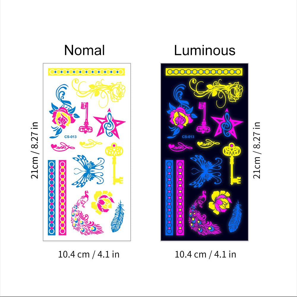 Luminous Sleeve Temporary Tattoo: The glow in the dark floral temporary tattoo set includes 12pcs with various exquisite designs, such as butterflies, flowers, feathers, geometric and more patterns. Each design is unique and allows you to create a customized look for parties and concerts.