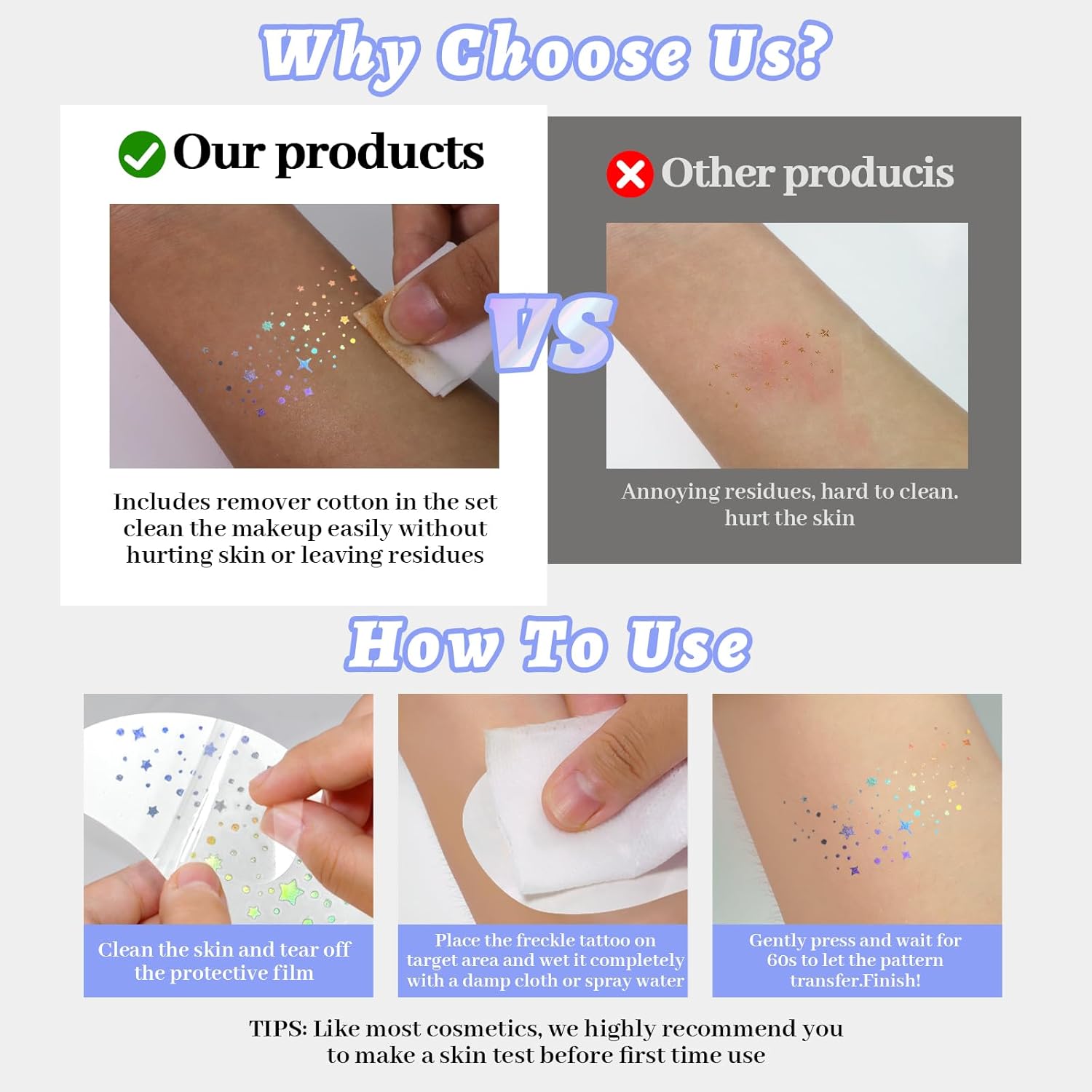 Waterproof and Long Lasting: This glitter freckle face tattoo set is uniquely waterproof and sweatproof, whether you're running or swimming or going to a party, this waterproof freckle patch stays on your face and always stays glittery