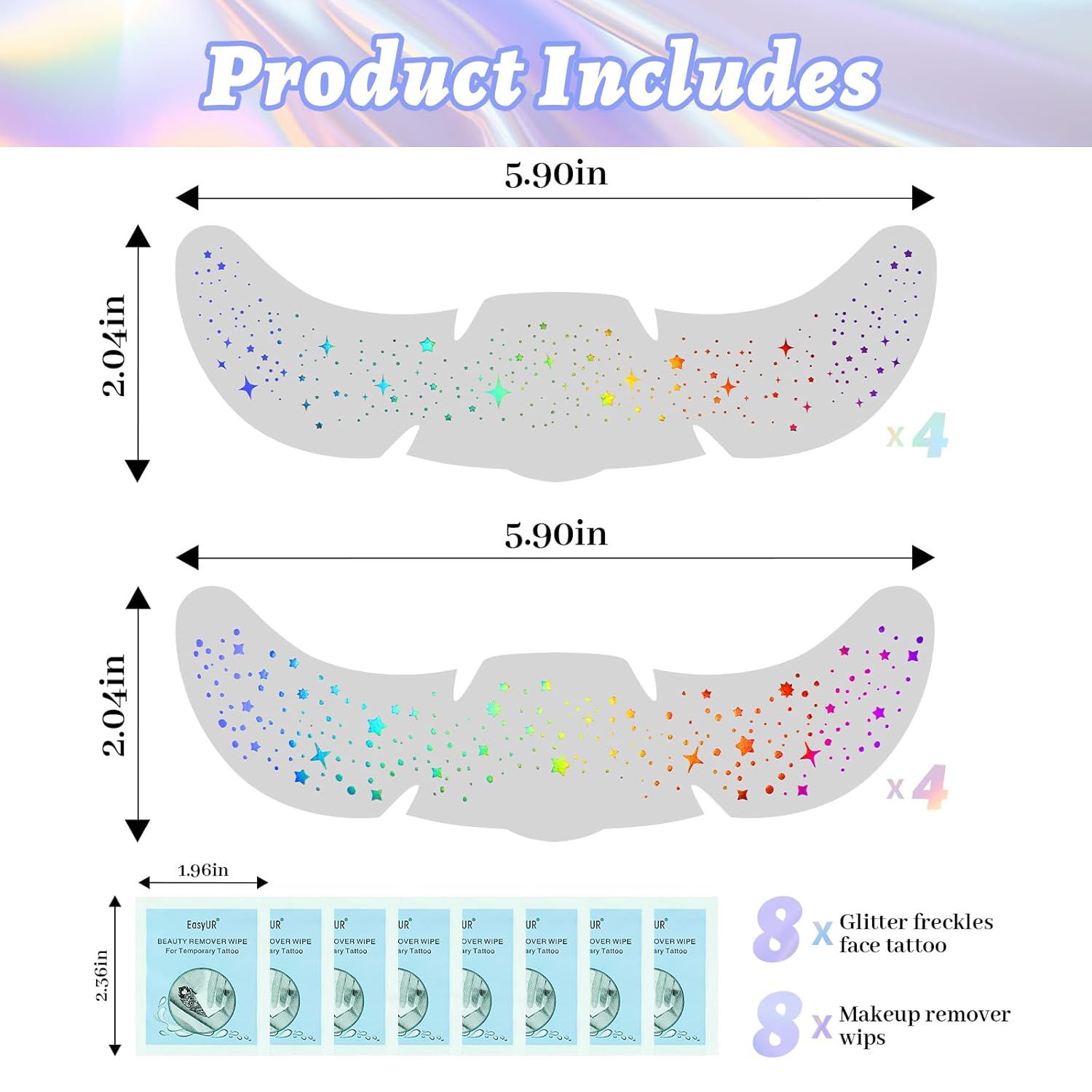 Glitter Freckles Face Tattoo: This set includes 12 pcs glitter temporary tattoo stickers and 8 tattoo sticker remover wipes, each piece has a different pattern, beautiful and natural, which can bring different experiences to users