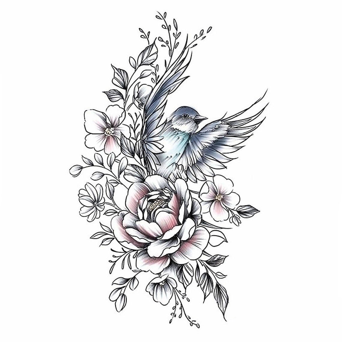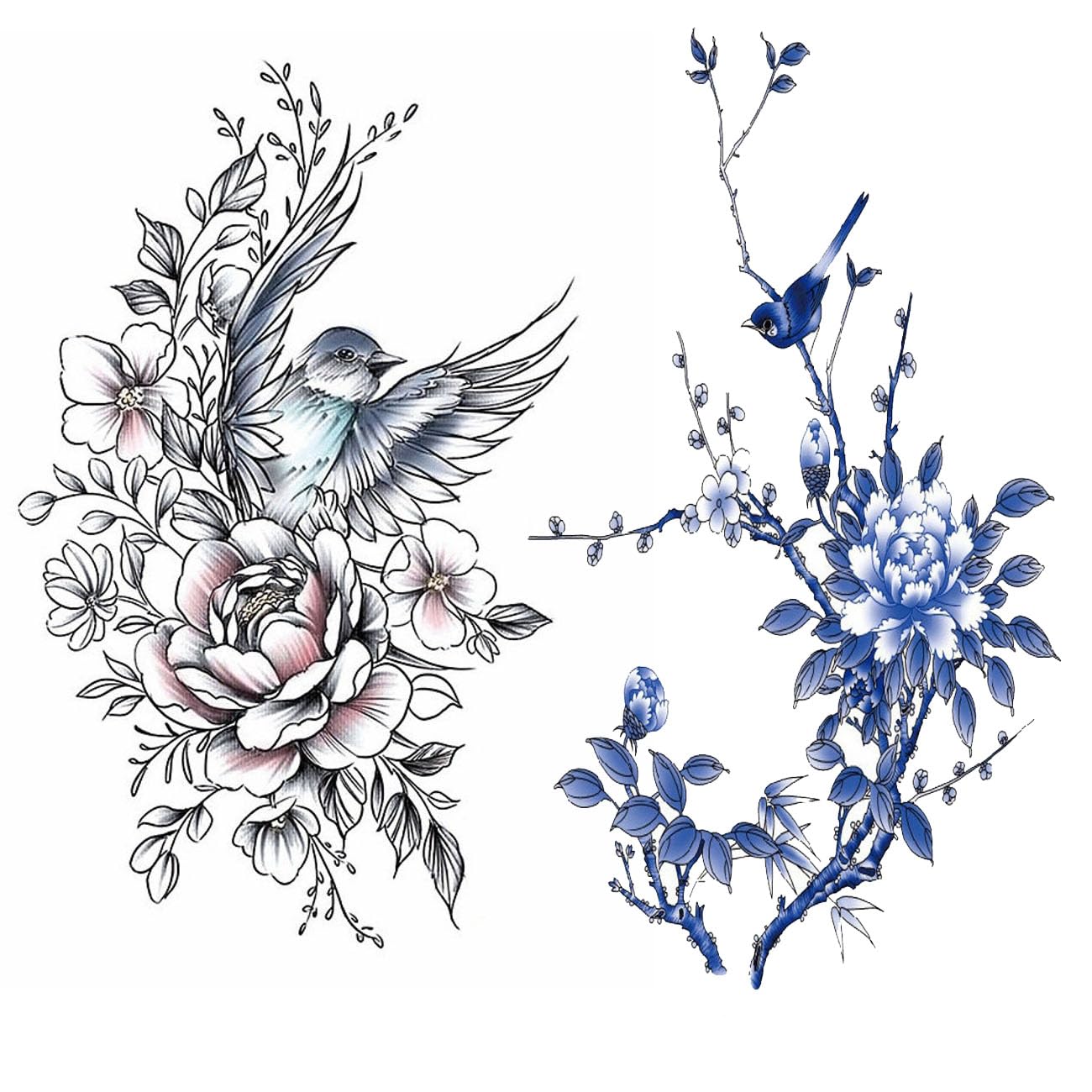 2PCS Peony Flower Bird Body Tattoos Flowers Hand Drawing for Men, Women, Adults, Kids, Realistic Head Body Art Sticker, Arm Neck Temporary Waterproof Art Tattoos