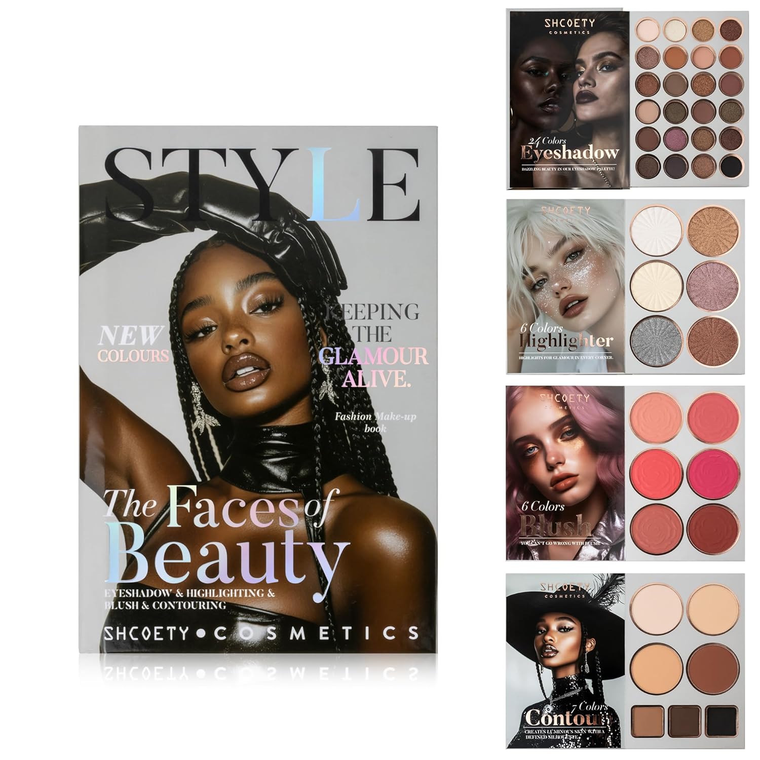COMPLETE MAKEUP KIT: Professional beauty book featuring 20 eyeshadows, 6 highlighters, 6 blush shades, and 6 contour powders in matte and shimmer finishes