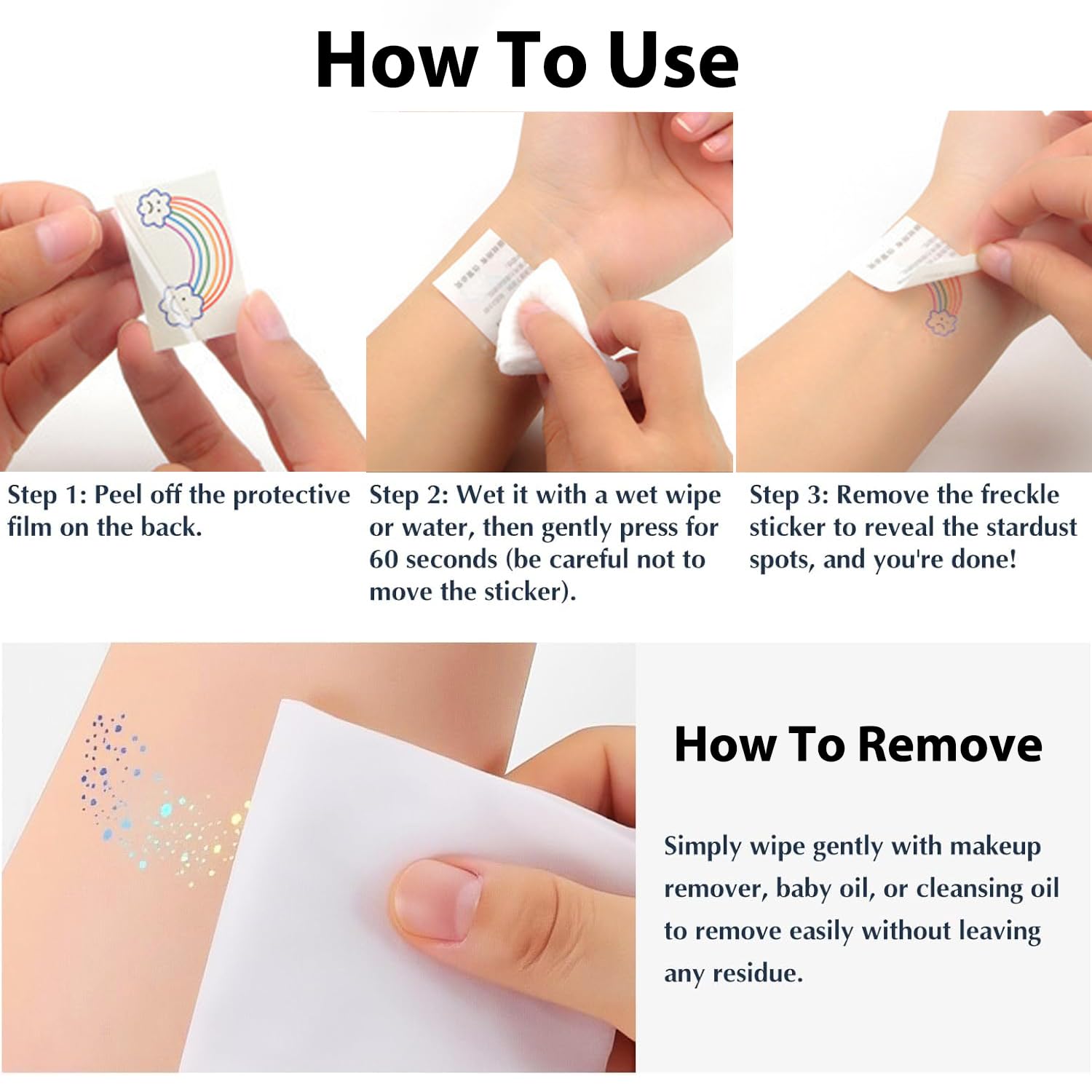 【How to Use】——Simply peel and stick the Glitter Freckles Face Tattoo onto your skin. Use a damp tissue to gently press for 10 seconds, then peel off to reveal beautiful, natural-looking freckles. It’s quick and effortless—just 2 minutes to create a flawless look.