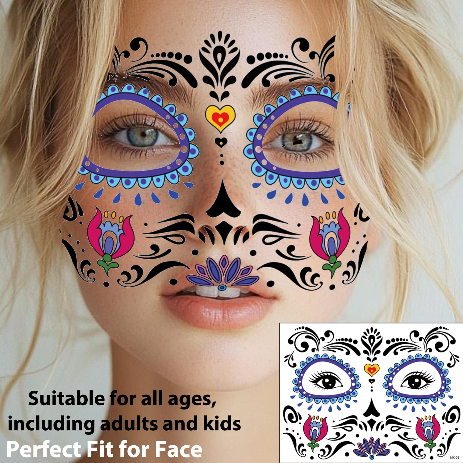 【Professional Temporary Tattoo Paper Set】Includes 4 sheets of premium Day Of The Dead Sugar Skull fake tattoos transfer paper for custom designs,each sheet face stickers size:6.3 * 4.72inches . Ideal for DIY temporary tattoos adult collectors and glitter makeup artists.