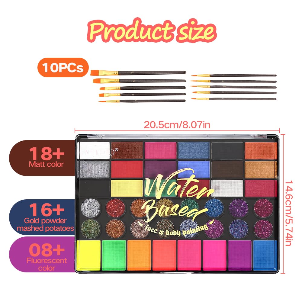 Exciting Variety for All: Features 18+ rich matte shades, 8+ vibrant fluorescent colors, and 16+ dazzling glitter-infused "gold dust" shades for sparkly accents. Safe face glitter for kids and versatile body paint for adults, ideal for festivals, cosplay, sports events, or adding magical shimmer to any look.