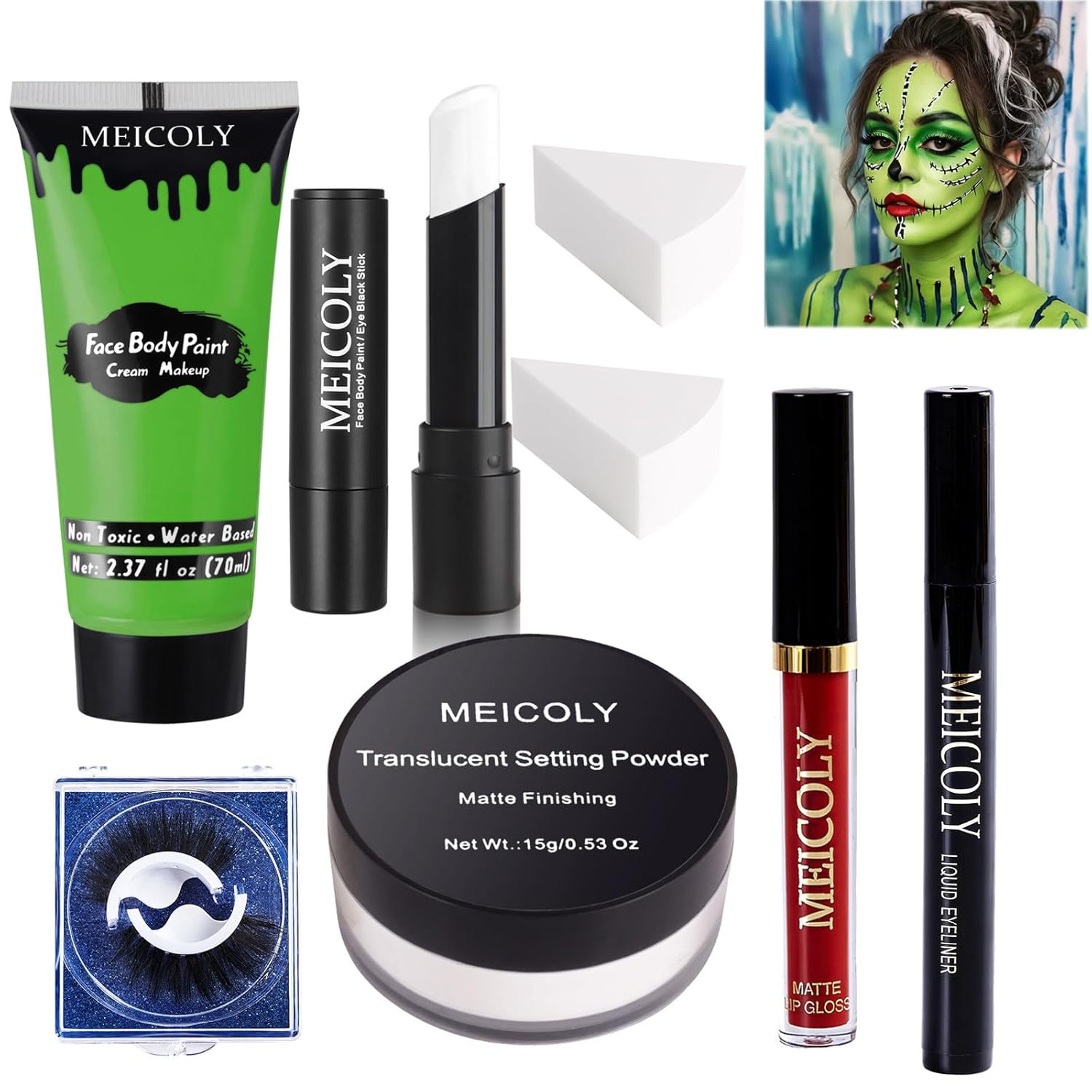 Complete Joker Clown Makeup Kit: Our SFX makeup set comes with white face paint,blue paint stick,black paint stick,red paint stick,setting powder,lime green hair dye,black lining pen,false eyelashes,red liquid lipstick,3 white sponges with a packaging box and instructions.Everything you need in one box to create stunning Joker, Clown or other spooky character looks – no need for separate purchases.