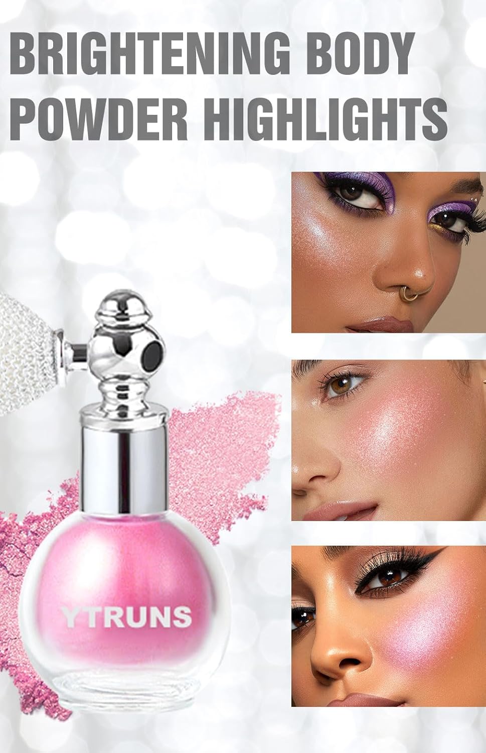 【High Gloss Spray】YTRUNS Gloss Spray Featuring an ultra-fine, lightweight powder formula, this spray creates a translucent pearlized layer that instantly brightens facial contours for a natural, lit-from-within glow. Perfect for collarbones, shoulders, and body highlighting. 8 shades to flatter all skin tones, delivering delicate crushed diamond-like radiance under light.