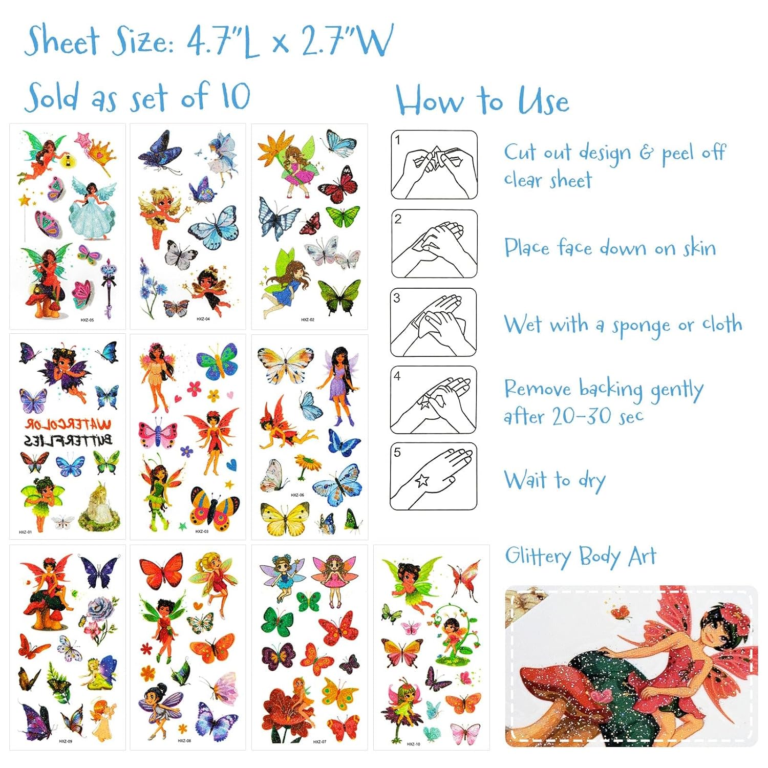 Sparkling Glitter Designs: Each set includes several sheets of vibrant temporary tattoos enhanced with eye-catching glitter for extra sparkle and fun.