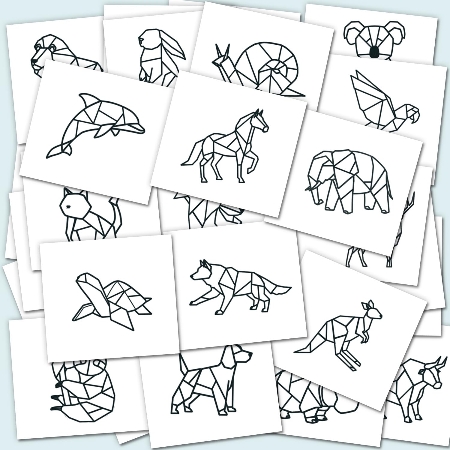 • DESIGN VARIETY: Set includes 32 INDIVIDUALLY CUT unique geometric animal designs featuring dolphins, elephants, horses, kangaroos, wolves, and more in minimalist origami-style line art