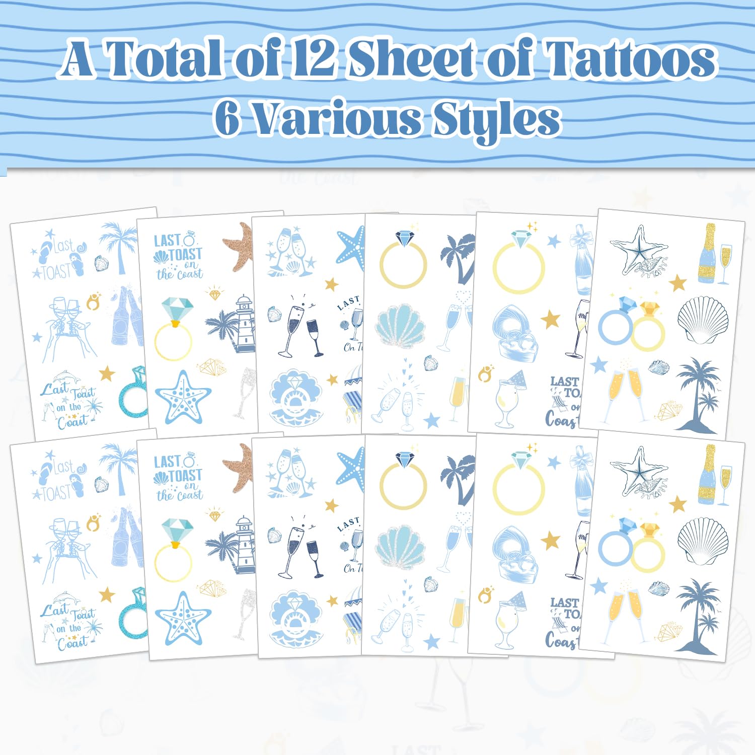 Last Toast On The Coast Bachelorette Decorations: You can get 12 sheets last toast on the coast bachelorette tattoo stickers in 6 various styles, in the package, each one has different blue coast bachelorette theme patterns on it, each sheet last toast on the coast sticker for beach bachelorette measures about 8 x 12 cm/ 3.1 x 4.7 inches, ample number can meet the needs of decoration for beach coast bachelorette party