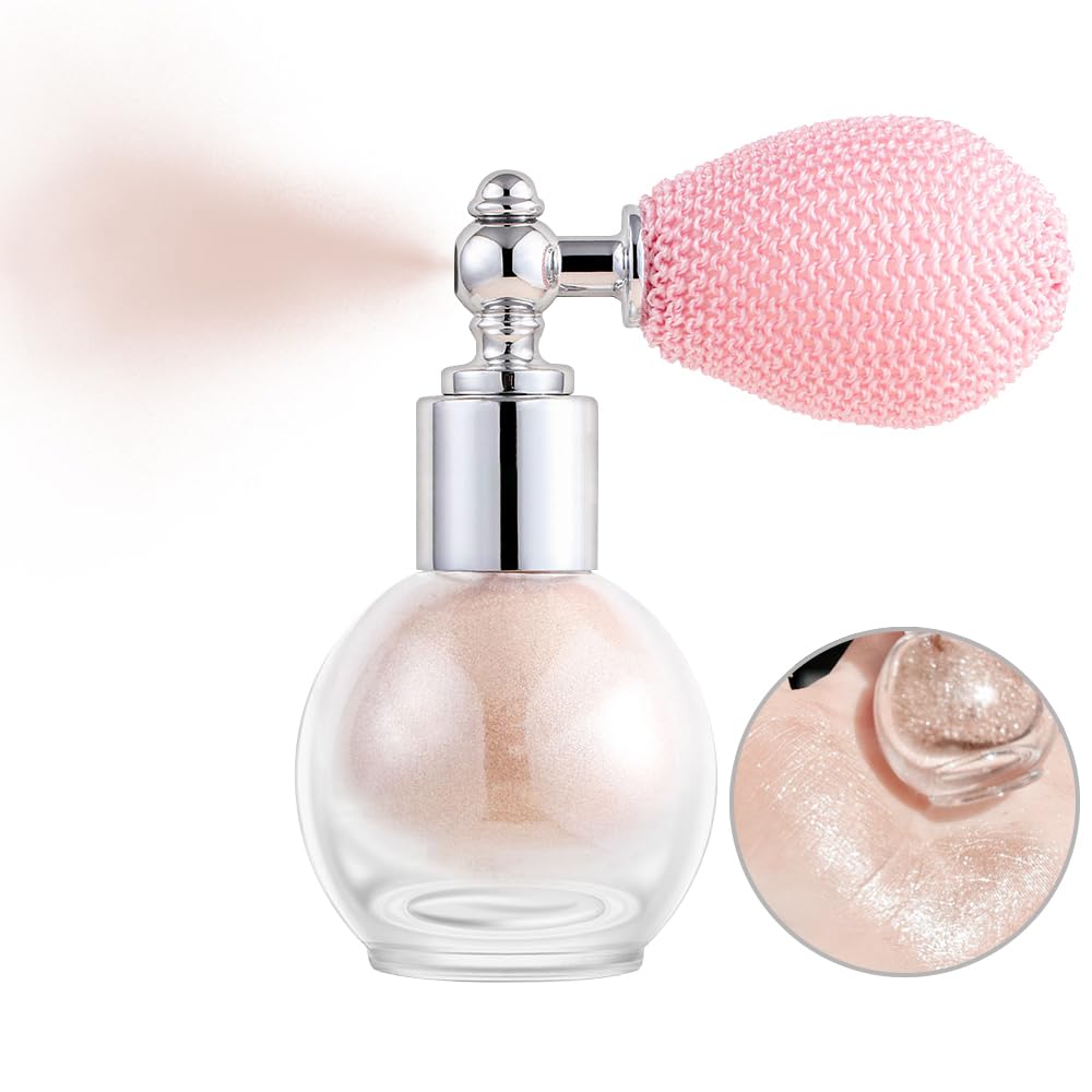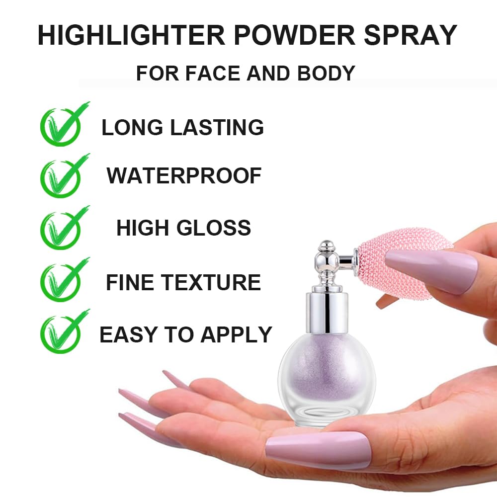 HIGHLIGHTER POWDER SPRAY :The texture of this highlighter spray is light and delicate, just spray it on your face, hair, shoulders, arms and other how to highlight areas, the highlighter powder spray can easily blend with your skin and give you a sparkling and glamorous glow. Let you shine in any occasion.