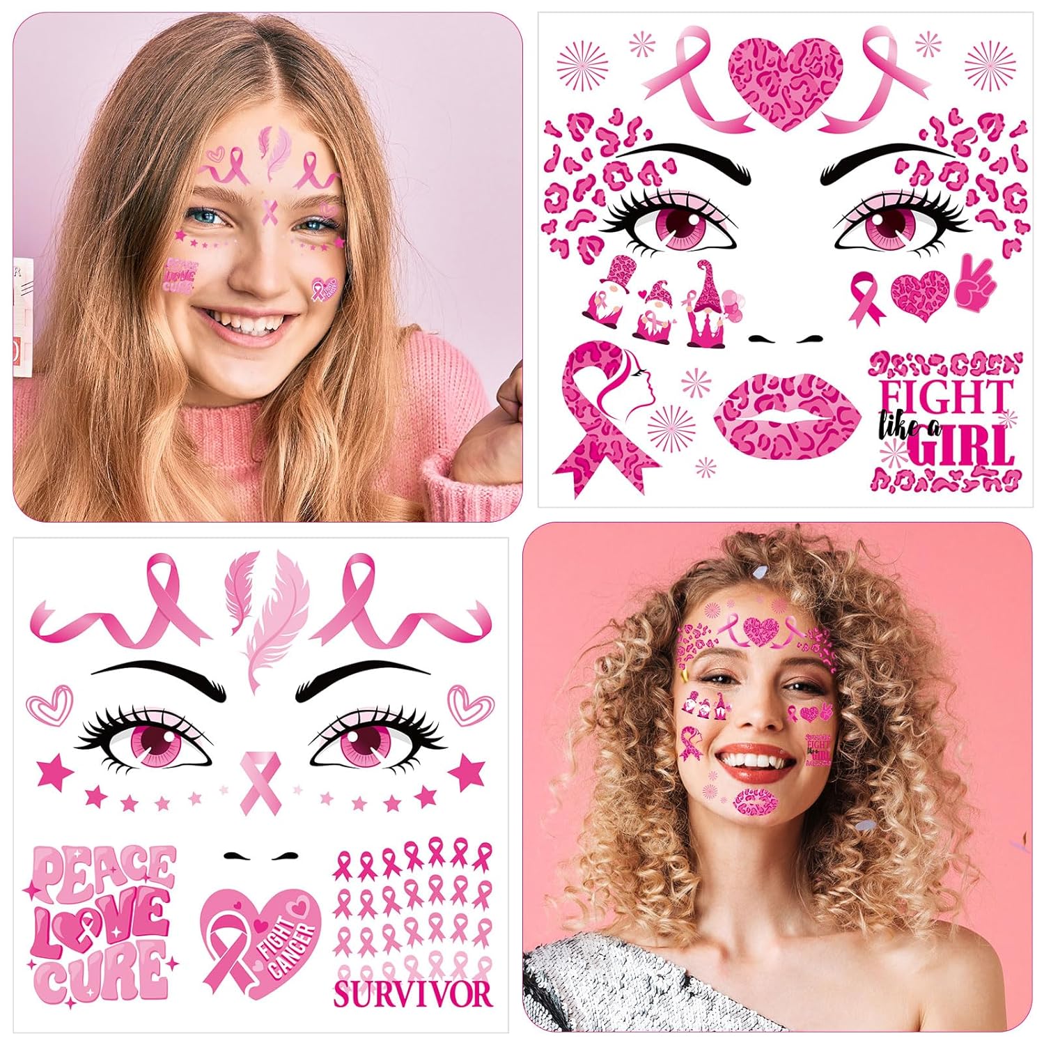 Breast Cancer Awareness Temporary Tattoos Stickers Include: You will receive 9 sheets Hope Fight Breast Cancer theme tattoos stickers with 9 sheets different patterns. Breast Cancer Awareness face tattoos has pink as its main color and contains many elements to fight breast cancer.