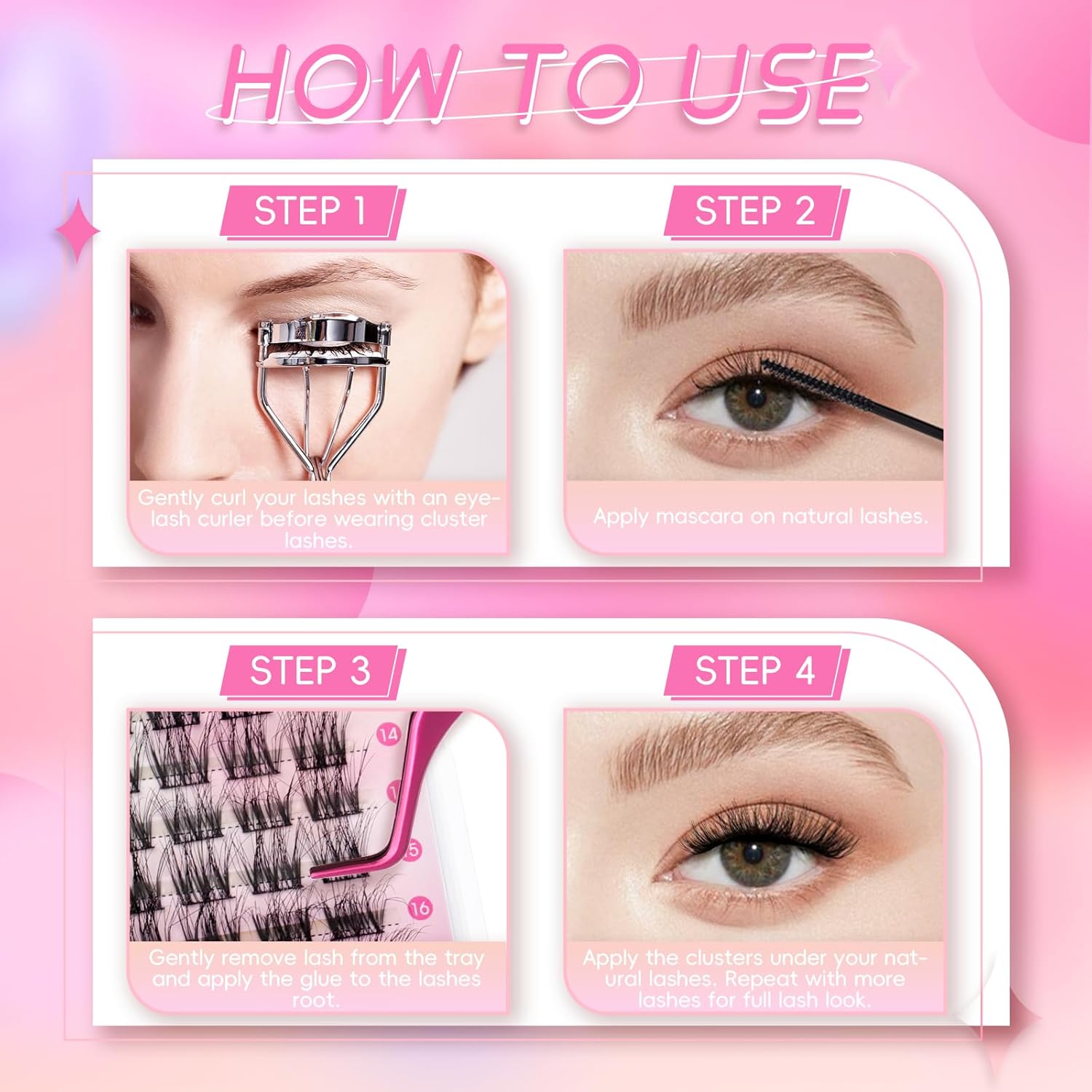 • Beginner Friendly: These lash clusters will match your makeup perfectly for both daily use and special events. You can easy to create your own lash look at home. Step 1: Gently curl your lashes with an eyelash curler before wearing cluster lashes. Step 2: Use tweezers to gently pick up the lash clusters from the strip. Step 3: Apply eyelash glue. Step 4: Wear lashes the way you like.
