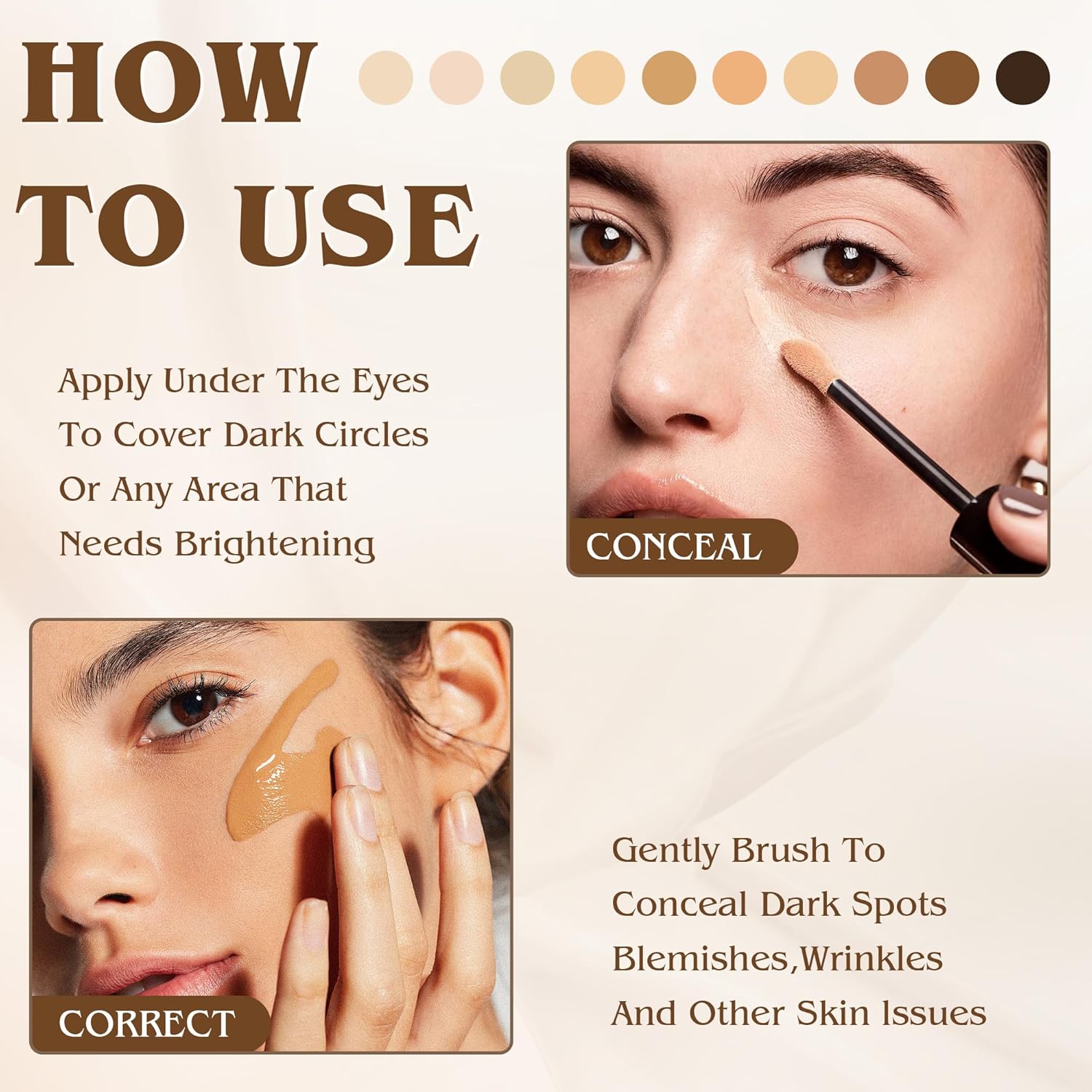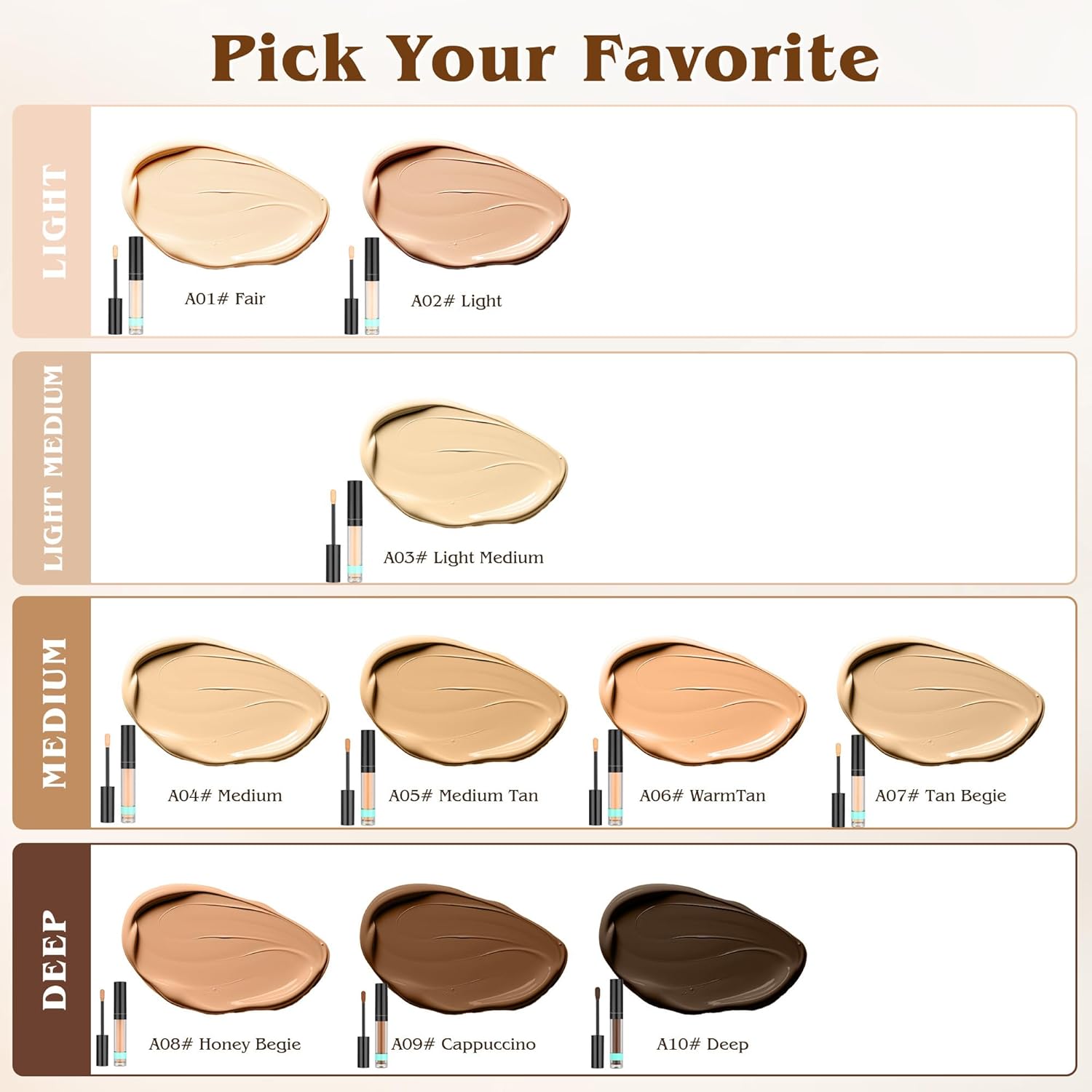 • Full Coverage: Fully conceals dark circles, blemishes, and skin imperfections while maintaining a natural look. This contouring concealer is available in 10 shades, ranging from fair, light, to medium skin tones, perfect for all skin types.