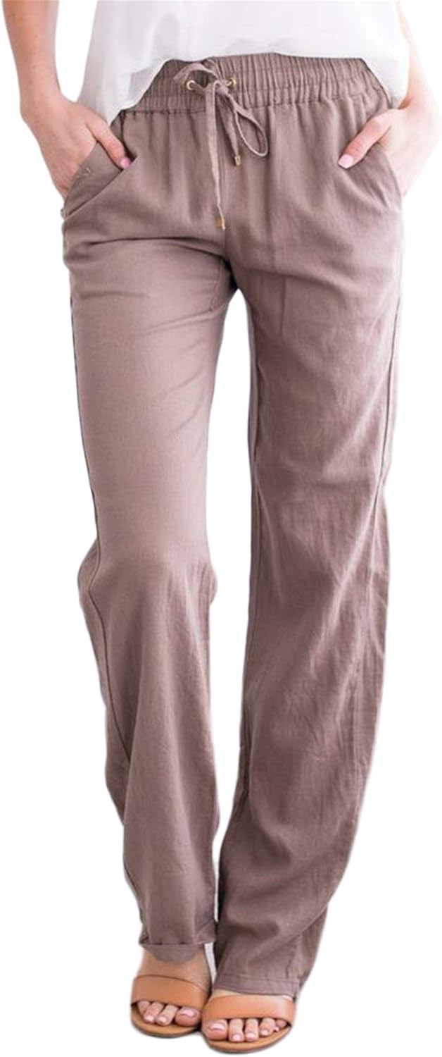 Womens Palazzo Linen Pants Wide Leg High Waisted Drawstring Casual Long Trousers Comfy Elastic Waistband Pants