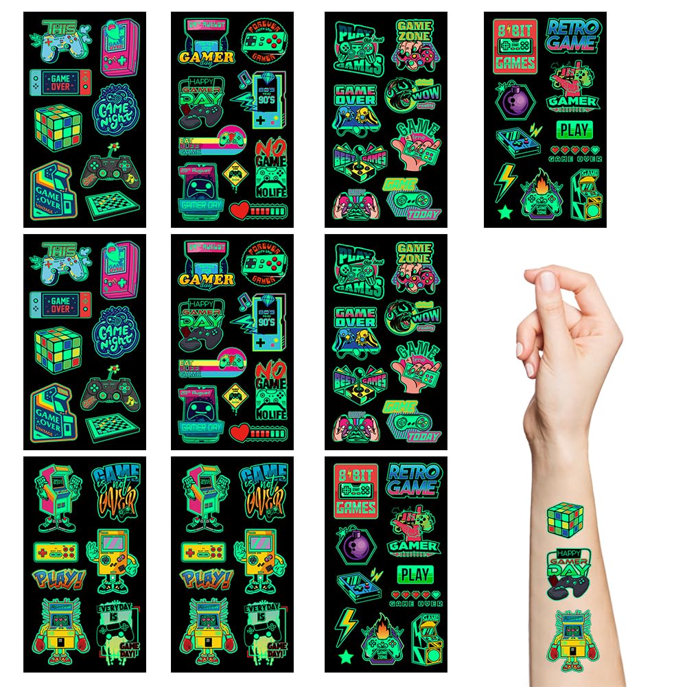 Luminous design:These video game tattoos featuring with luminous effect, which will make you be unique at the party! Tips:Illuminating these tattoos a few minutes in advance under a lamp or sunlight will make the tattoos work better in the dark.