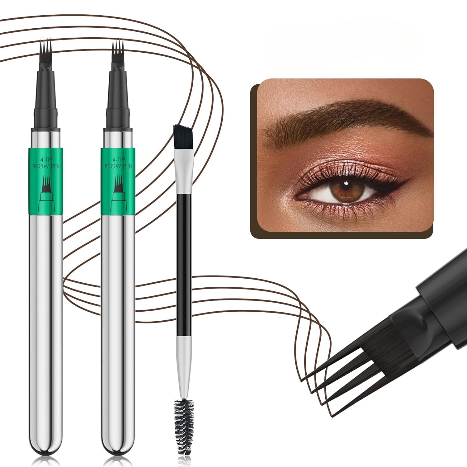 2 Pcs Microblading Eyebrow Pen Set with Eyebrow Brush, 3D Waterproof 4-Tip Precision Eyebrow Pencil, Long-Lasting Natural Fine Stroke Magic Eyebrow Pencil for Women Stay All Day (Brown)