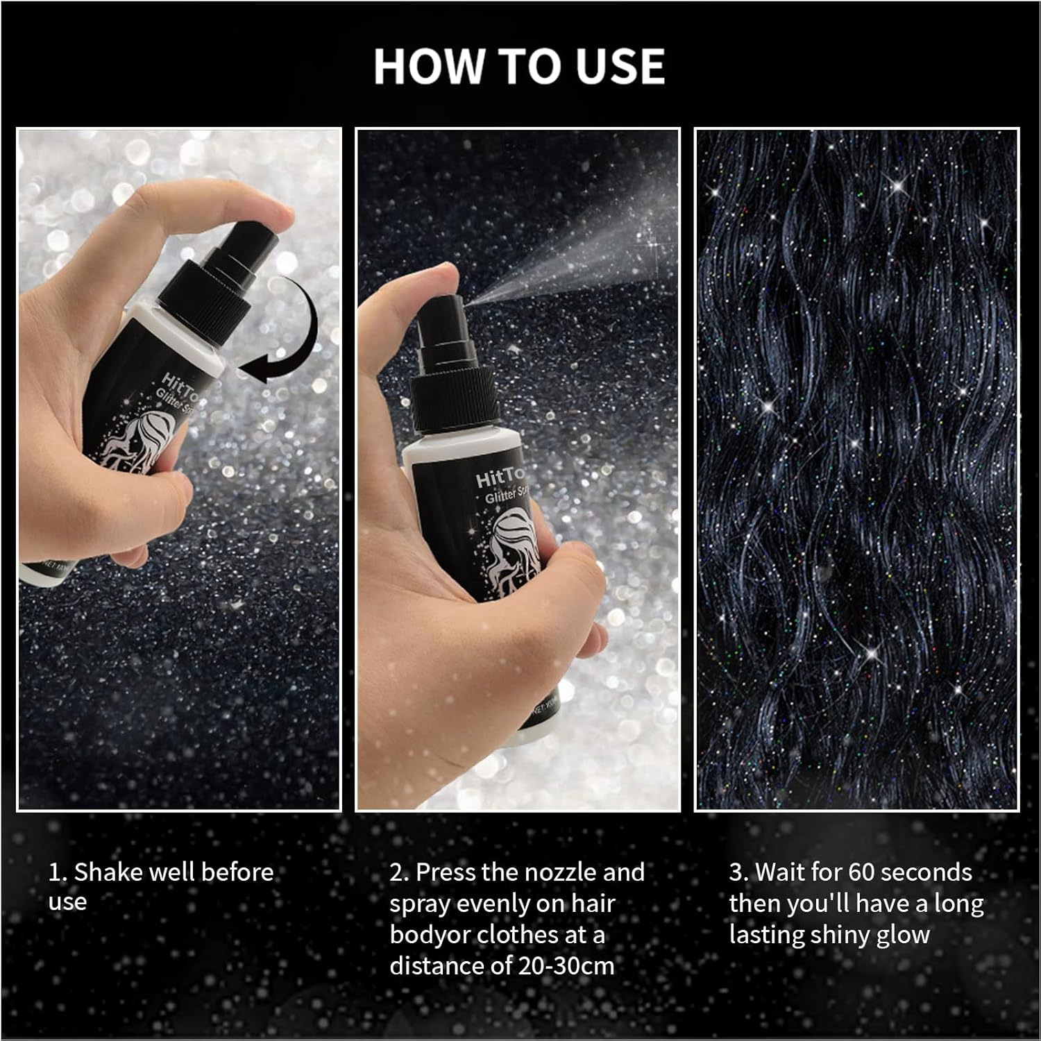 Lightweight & Portable: Designed to be small and portable, our glitter spray bottle lets you shine anywhere, anytime. Shake the bottle before use, lightly spray on your skin, and the sparkling glitter will gently adhere, giving you a radiant glow wherever you go.