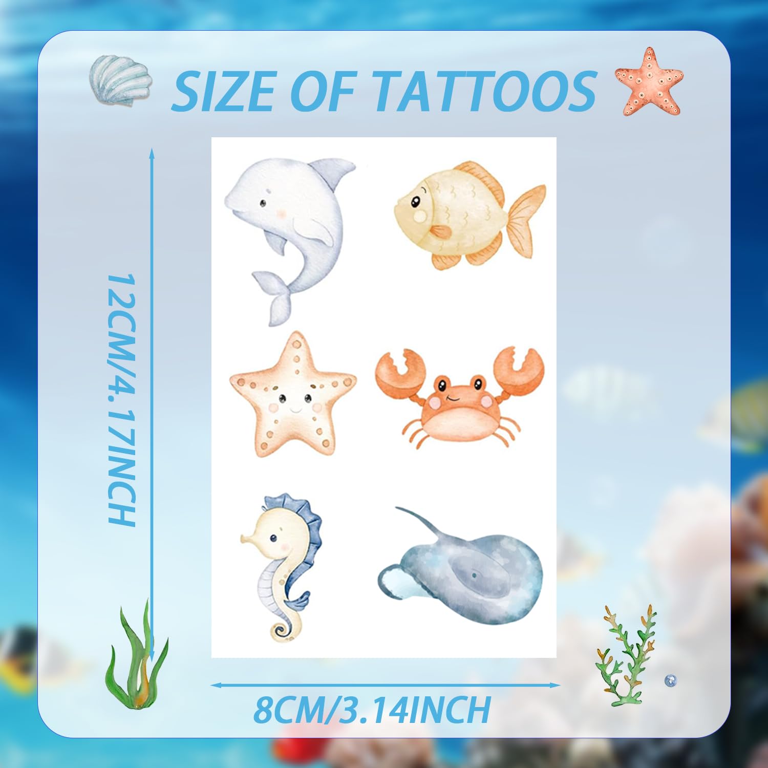 • Sea Animal Stickers: There are 24 sheet (144pcs) ocean animal temporary tattoos stickers offer 72 cute styles to choose from, colorful and high-resolution, under the sea stickers tattoos designed by various ocean animals, starfish, turtle, sharks, jellyfish, octopus, crab, clown fish, etc. Super cute sea creature stickers make you feel like you are in the underwater world.