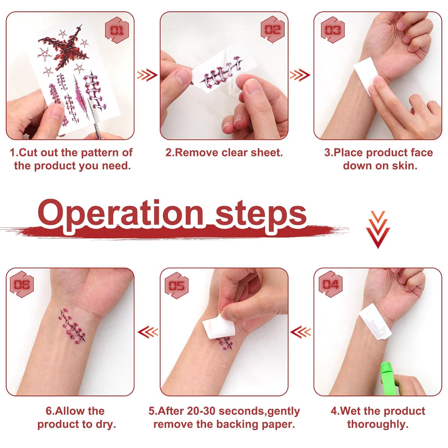 Wide Range Of Applications: This fake cuts set is an ideal match for role-playing, punk parties, clubs, carnivals, dancing, vacations, concerts, formal dinners, music festivals, zombie makeup sets, vampire bite tattoo role-playing, horror makeup parties, and funny parties, etc. It can be worn on the face, shoulders, hands, neck, thighs, chest, or any part of your body that you like, making you look mysterious and terrifying