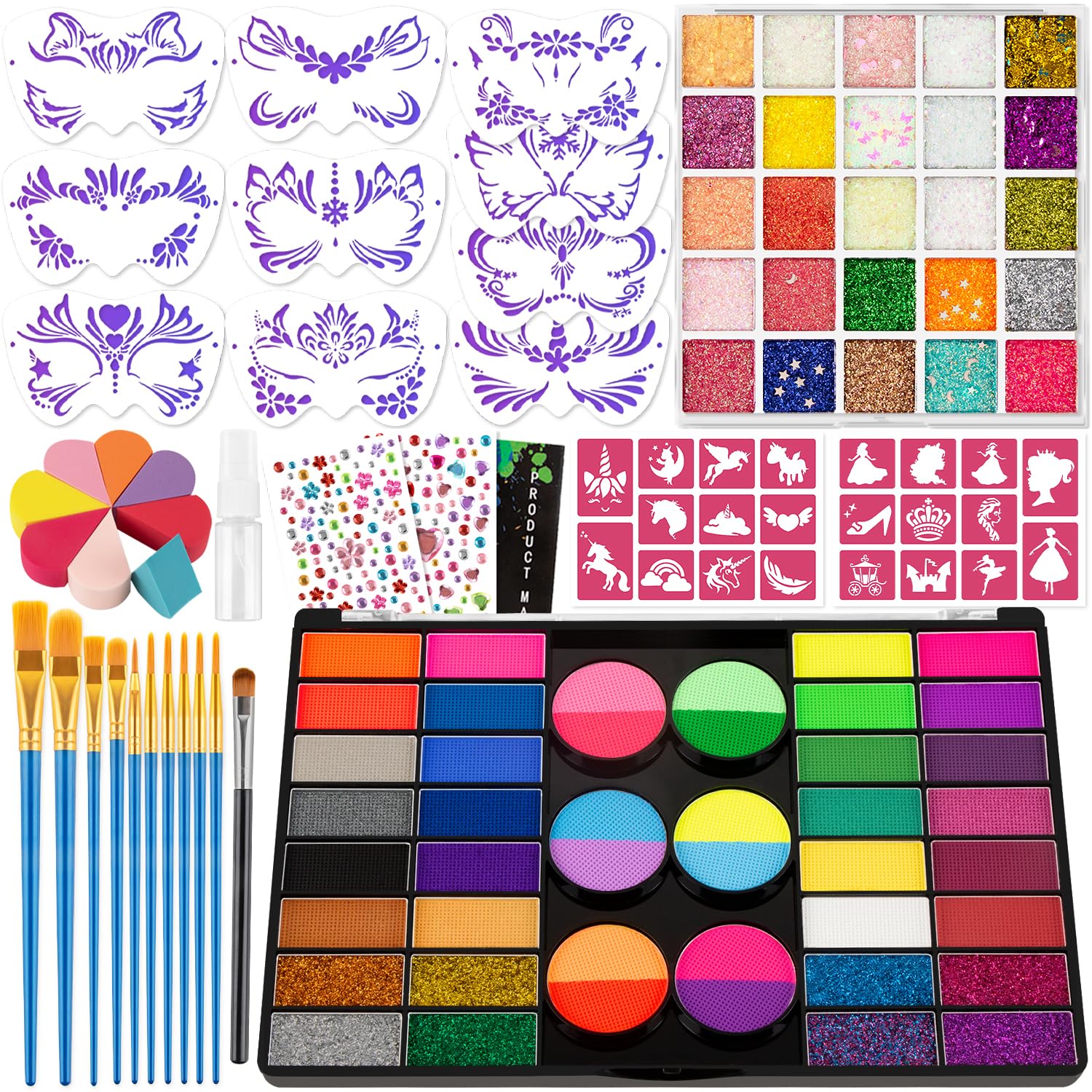 【Face Painting Kit for Kids and Adults】- Includes 44vibrant colors (16 matte shades, 8 glitter shades, and 20 UV-glow paints), 25 colors eye glitter palette, 10 reusable face painting stencils, 11 brushes, 2 gem stickers, 2 sheets / 22 tattoo templates, 8 makeup sponge, , and instructions. A comprehensive professional face painting kit, these tools empower everyone to create stunning face and body art with ease.