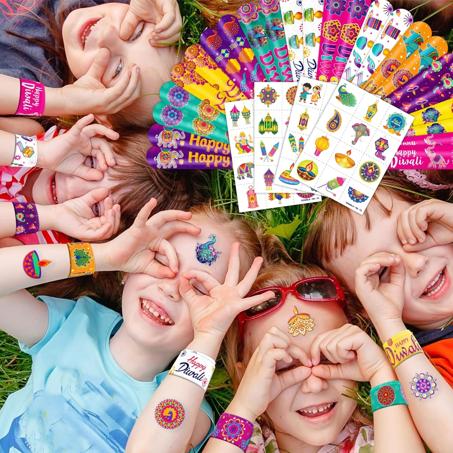 DIWALI-THEMED PARTY FAVORS – 72PCS VALUE SET Includes 24 festive slap bracelets and 48 pre-cut temporary tattoos with bright Diwali-inspired designs like rangoli and diyas. Perfect for party favors, return gifts, classroom rewards, and festival game prizes.