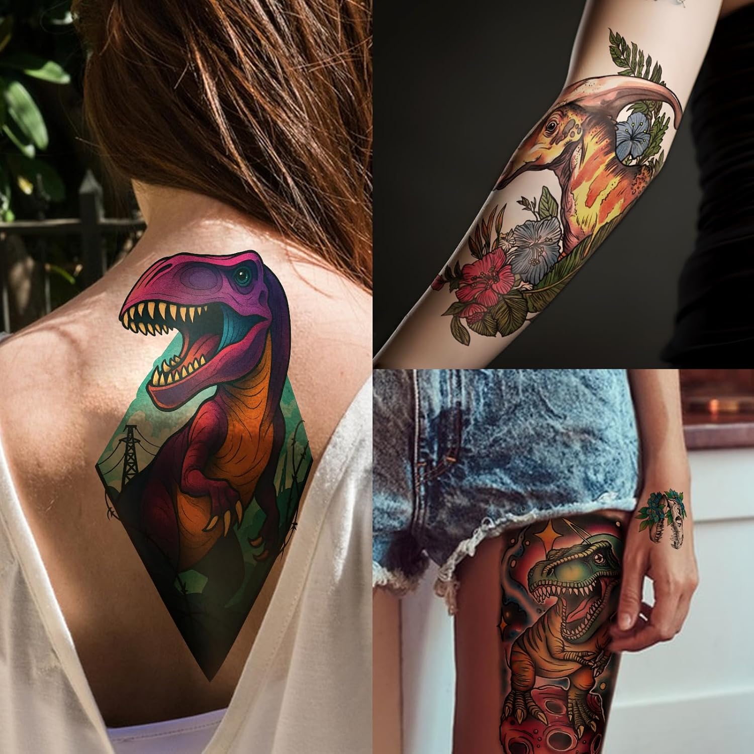 【Beautiful Bright Color Dinosaur Fake Tattoo】Uniquely designed with bright colors, Dinosaur Temporary Tattoos are vibrant,lovely and waterproof,can also apply them to smooth objects such as glass,stationery,paper, plastic, phone case, bag and book.