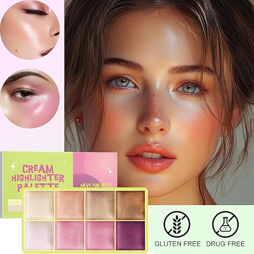 Highlighter Curve Comet Case, 8 Colors Cream Highlighter Shimmer Glow Silver Gold Blossom Glowy Finish Makeup Palette