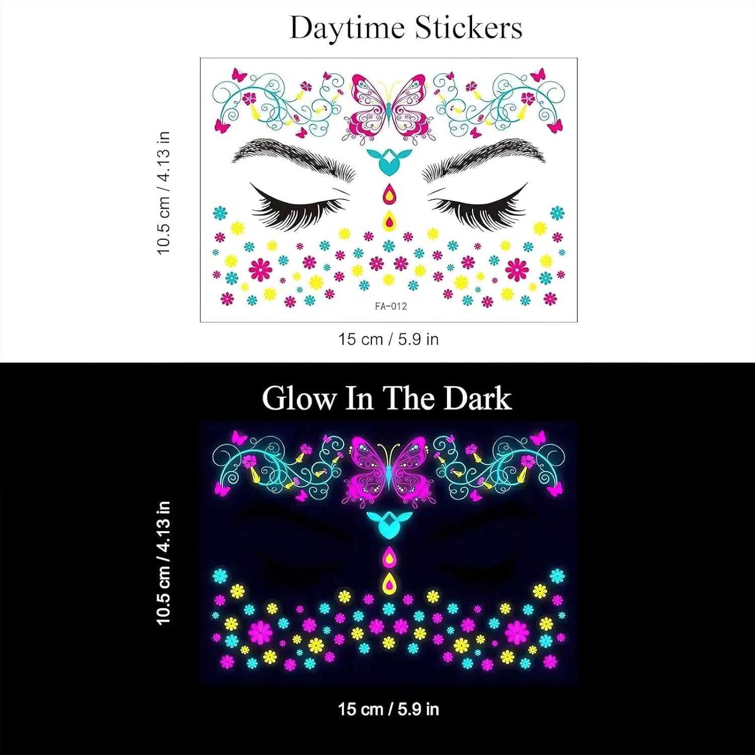 Package: Includes 8 glowing face temporary tattoo stickers with fluorescent designs, including glowing tattoos with different designs