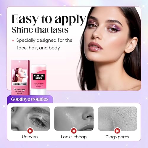 【Effortless No-Mess Application】Enjoy easy apply glitter stick functionality—just glides the glitter stick across your skin, face, or hair. It requires no glitter glue, dries instantly, and delivers a smooth application for festival makeup or party looks.