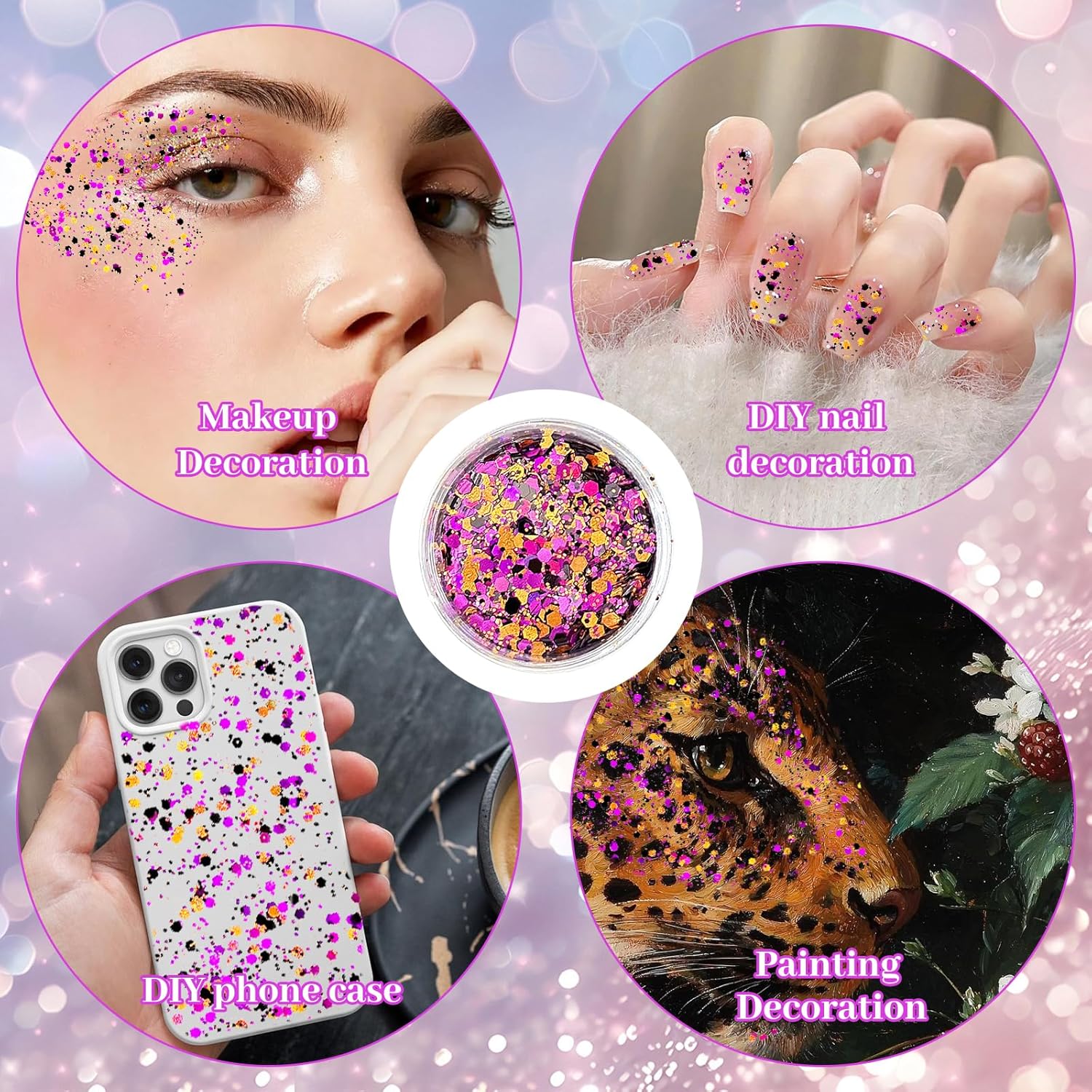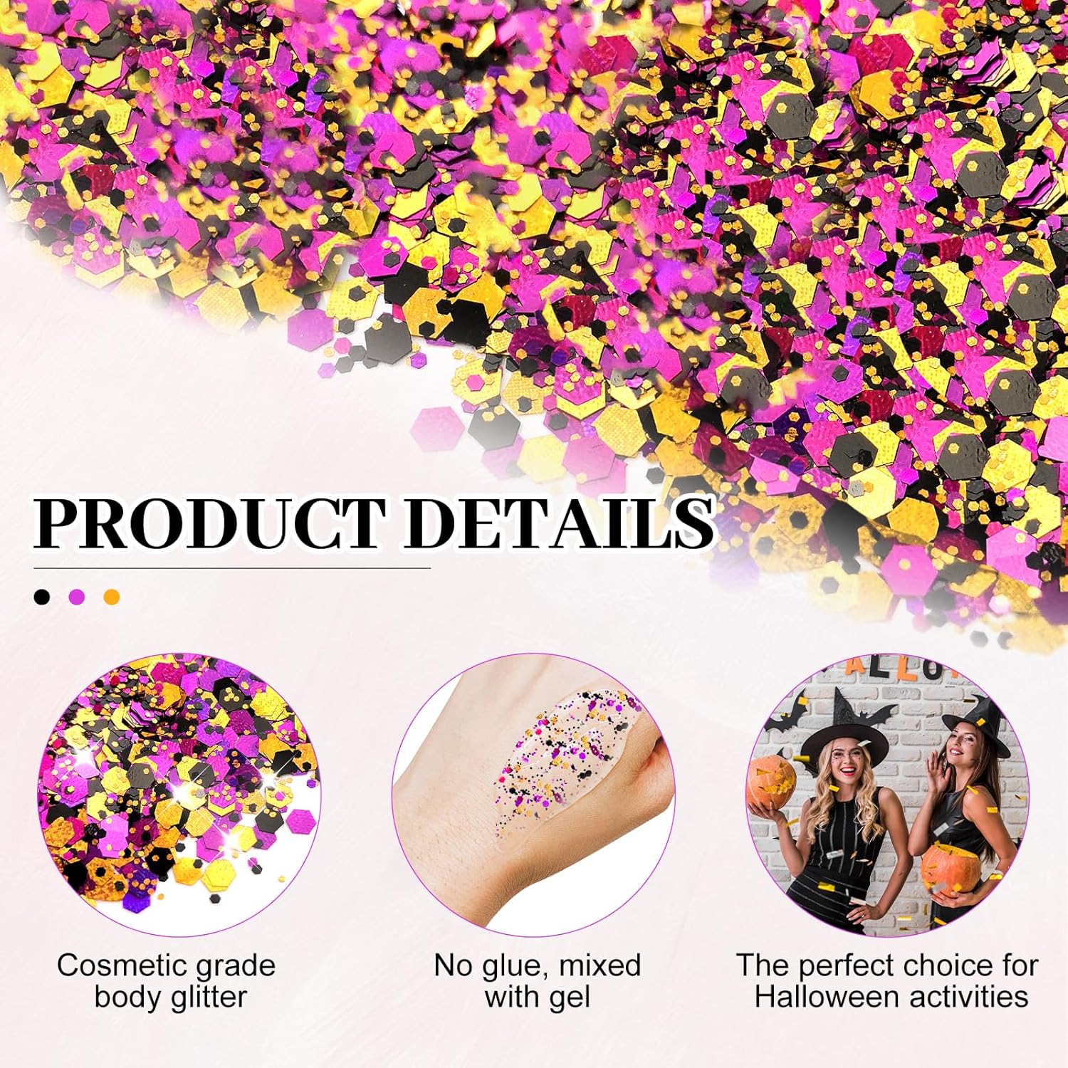 PERFECT FOR HALLOWEEN EVENTS: This glitter is ideal for Halloween decorations, costume parties, festivals, DIY projects, and any other spooky events. Show your love for Halloween and add some sparkle to your look with this Black Orange Purple Mixed Holographic Chunky Glitter with Gel.