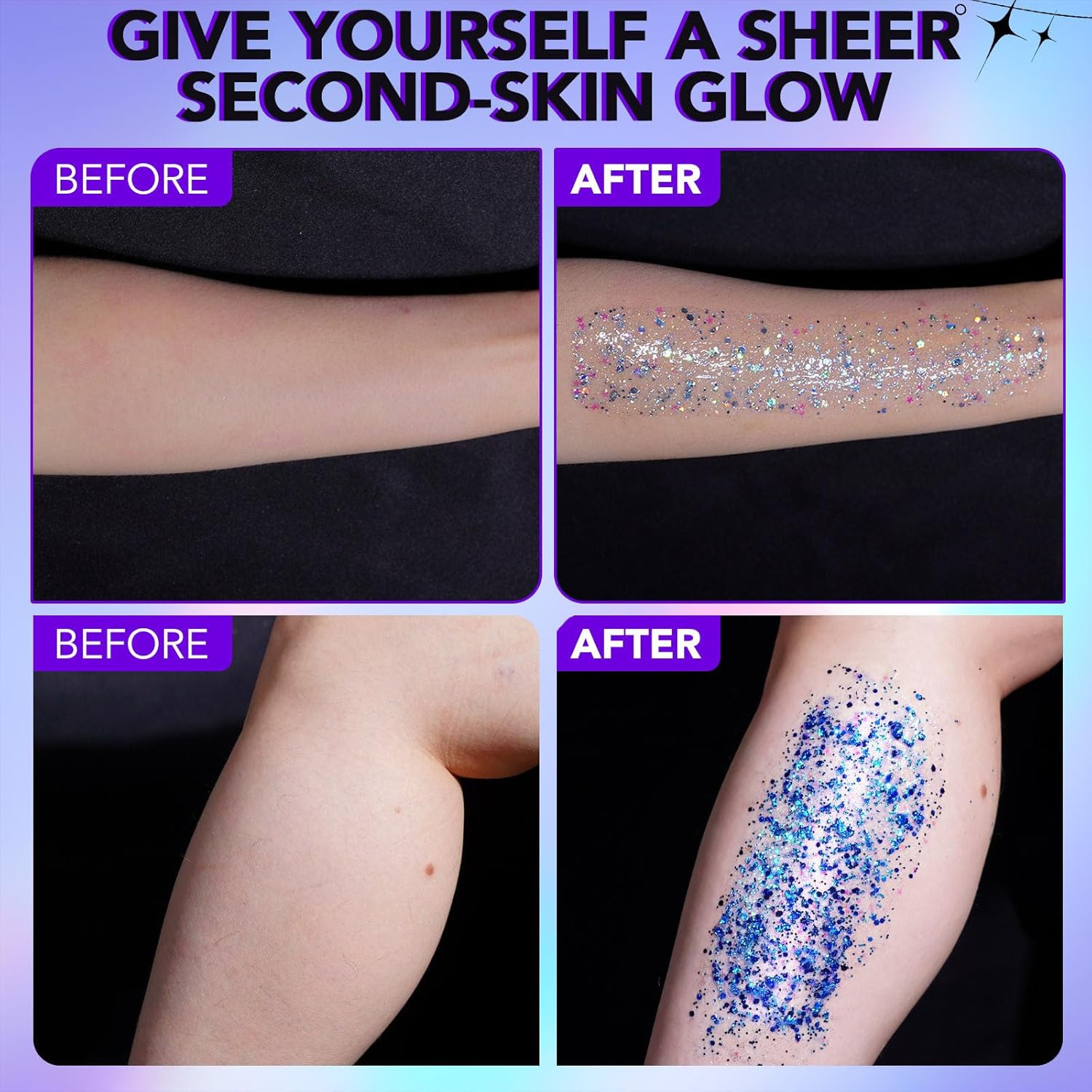 Our cosmetic glitter is self-adhesive, no glitter glue required. It makes applying Fourth of July accessories effortless. Just glide it on and spread evenly with fingers, easy and quick, easy to control the amount applied. TIPS: For maximum staying power, avoid rubbing after application.