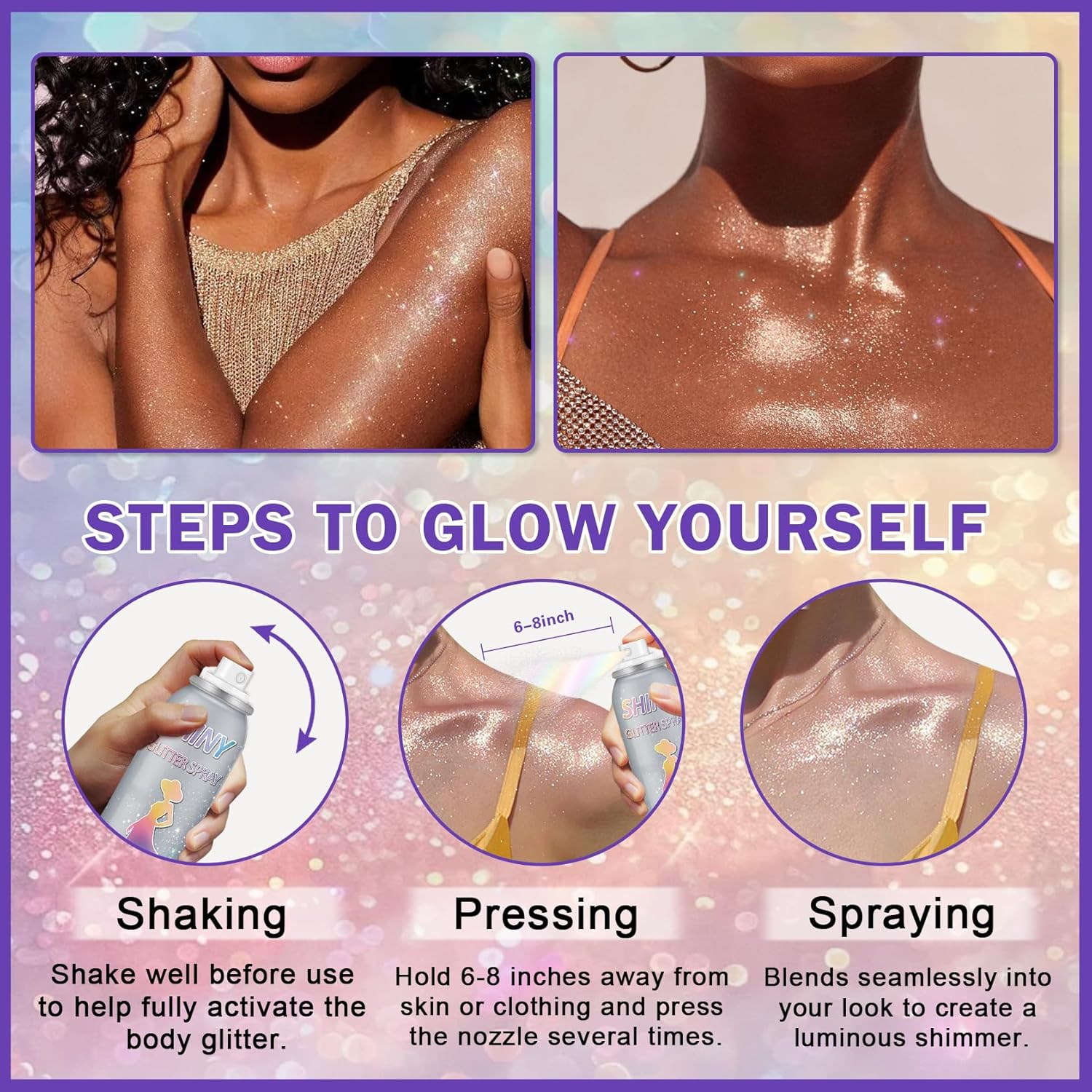 【Easy to Use】Shake well before use to ensure even distribution of the glitter.Spray 6-8 inches from the skin,allowing the glitter to adhere gently for a unique sparkling effect