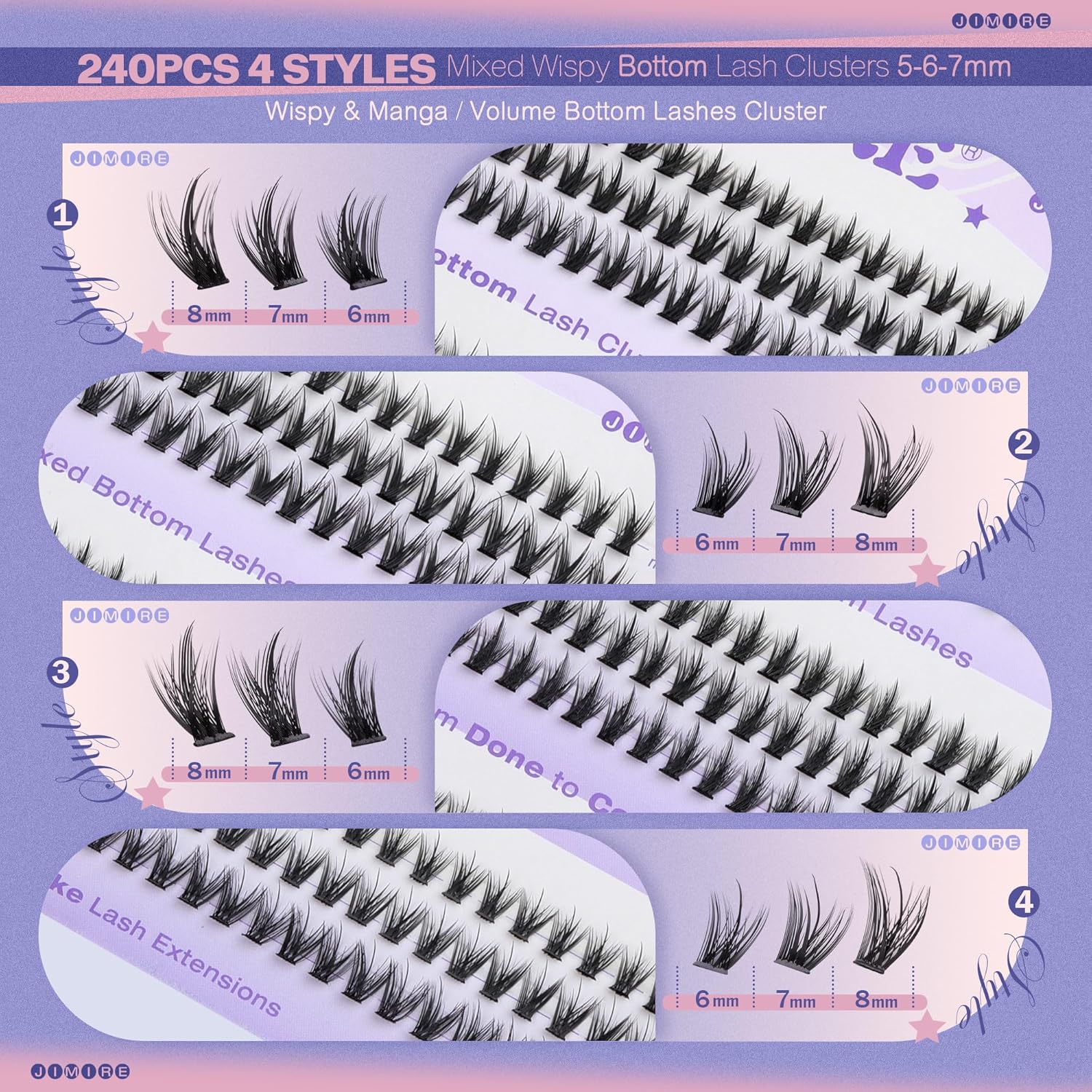 240Pcs 4 Different Styles Bottom Individual Lashes for Every Occasion - Choose from 4 curated designs—manga-inspired, spiky-dramatic, voluminous-spiky hybrid, and more lower eyelash extensions —to suit any mood, event, or personal style preference