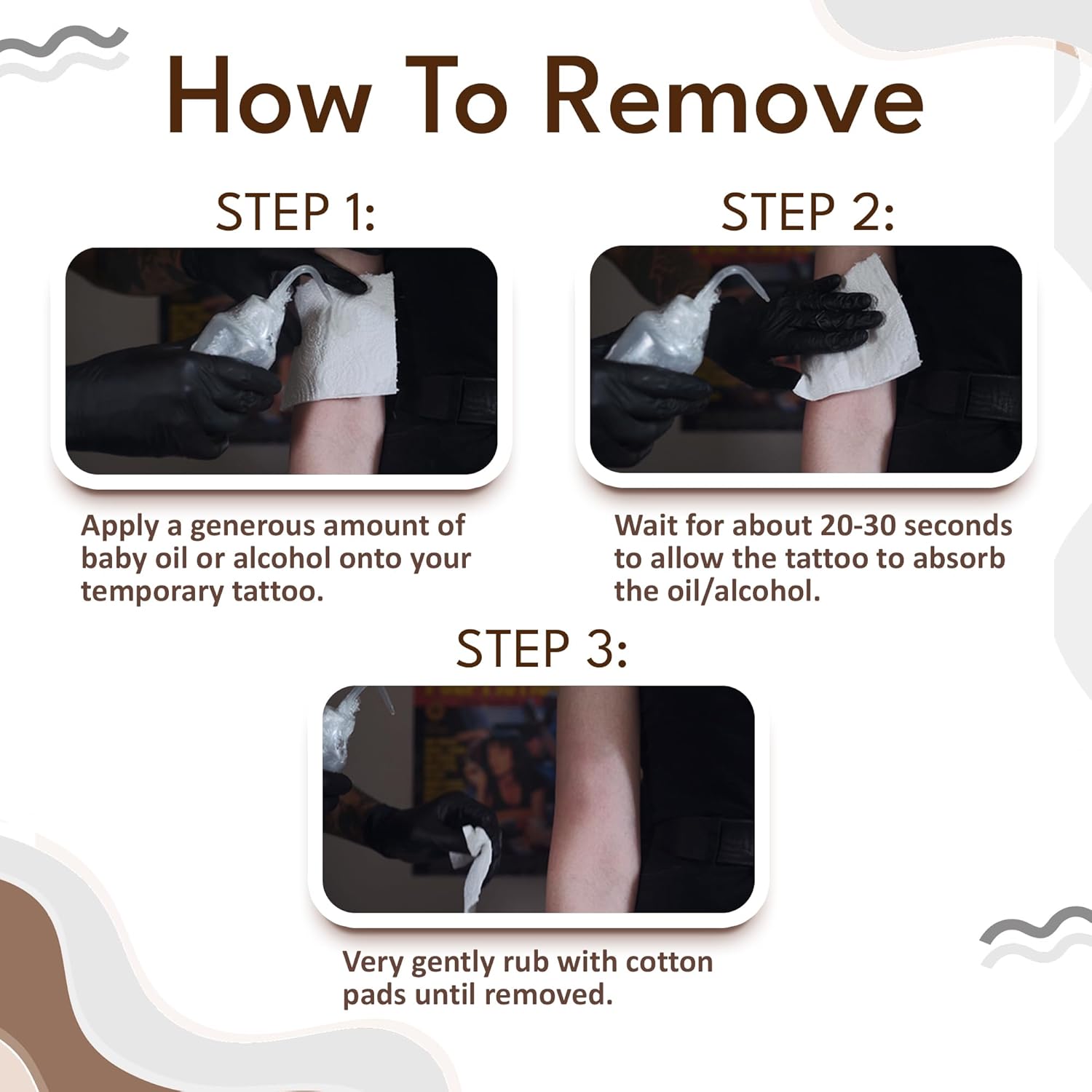 ✅ EASY TO USE. 1. Remove the clear film. 2. Place the tattoo on clean, dry skin. 3. Apply a damp paper towel to the tattoo. Do NOT dampen before applying on the skin. 13. Remove the paper and leave the tattoo to dry. Now, you can enjoy temporary ink for up to a week!