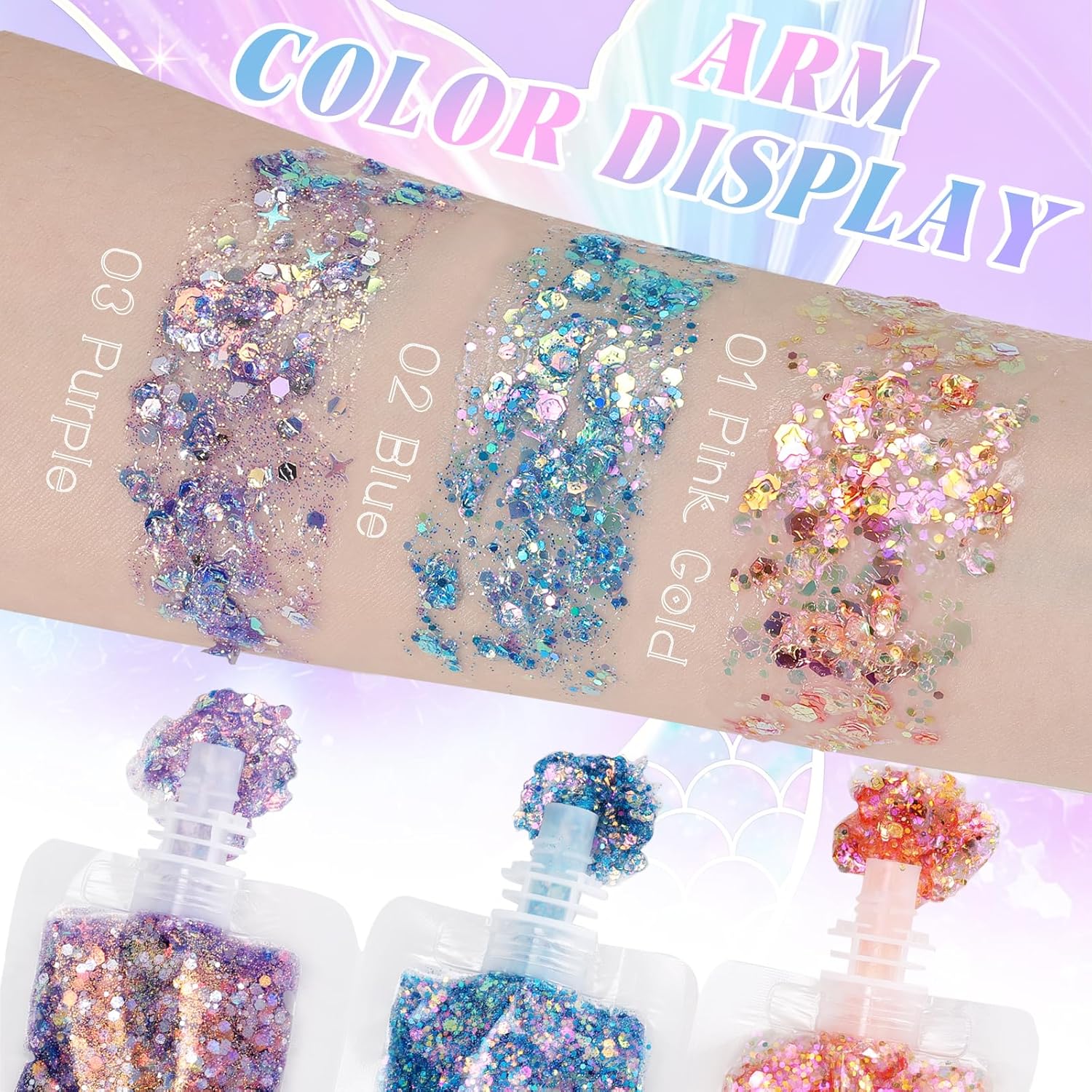 Easy to Use: This body glitter comes with its own gel, so you can use it easily without any extra tools. Simply apply it to the areas where you want to create a sparkling look. Whether you're touching up your makeup quickly or creating a new look, you can do it in no time.