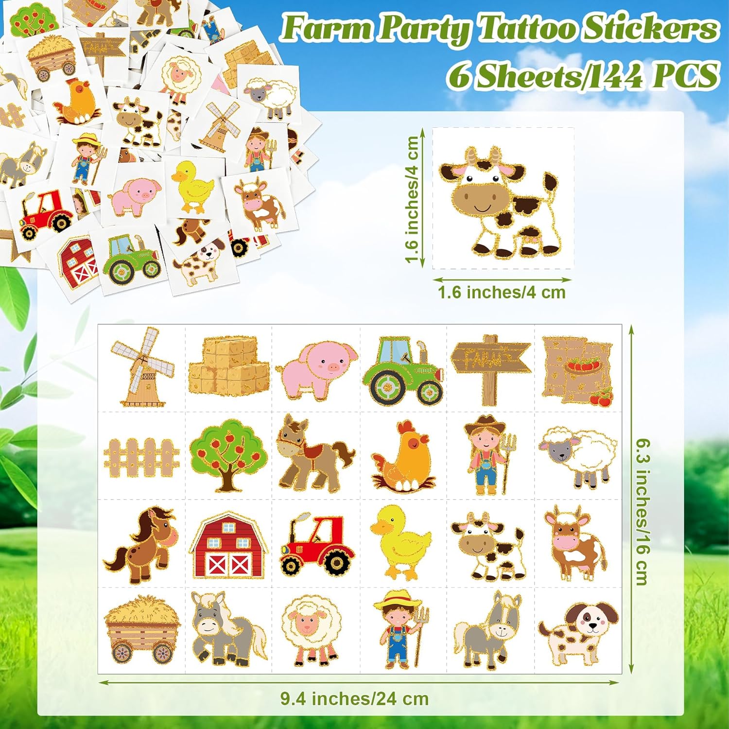 Package Includes: the package includes 6 sheets, with each sheet containing 24 distinct farm patterns, totaling 144 individual temporary tattoos, ideal for farm themed party favors, classrooms, birthday celebrations, family gatherings, or sharing with friends and loved ones