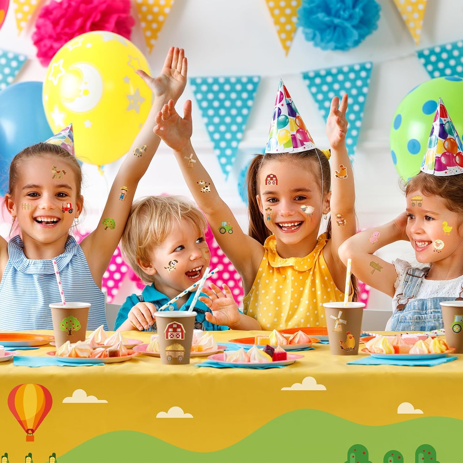 Farm Themed Design: the farm party supplies set features 24 unique temporary tattoo designs, each thoughtfully crafted with classic farm animals and barnyard elements, like haystacks, charming red barns, spinning windmills, tractors, cows, donkeys, hens, and more; printed using premium inks, these farm animals tattoos deliver vibrant and long-lasting colors