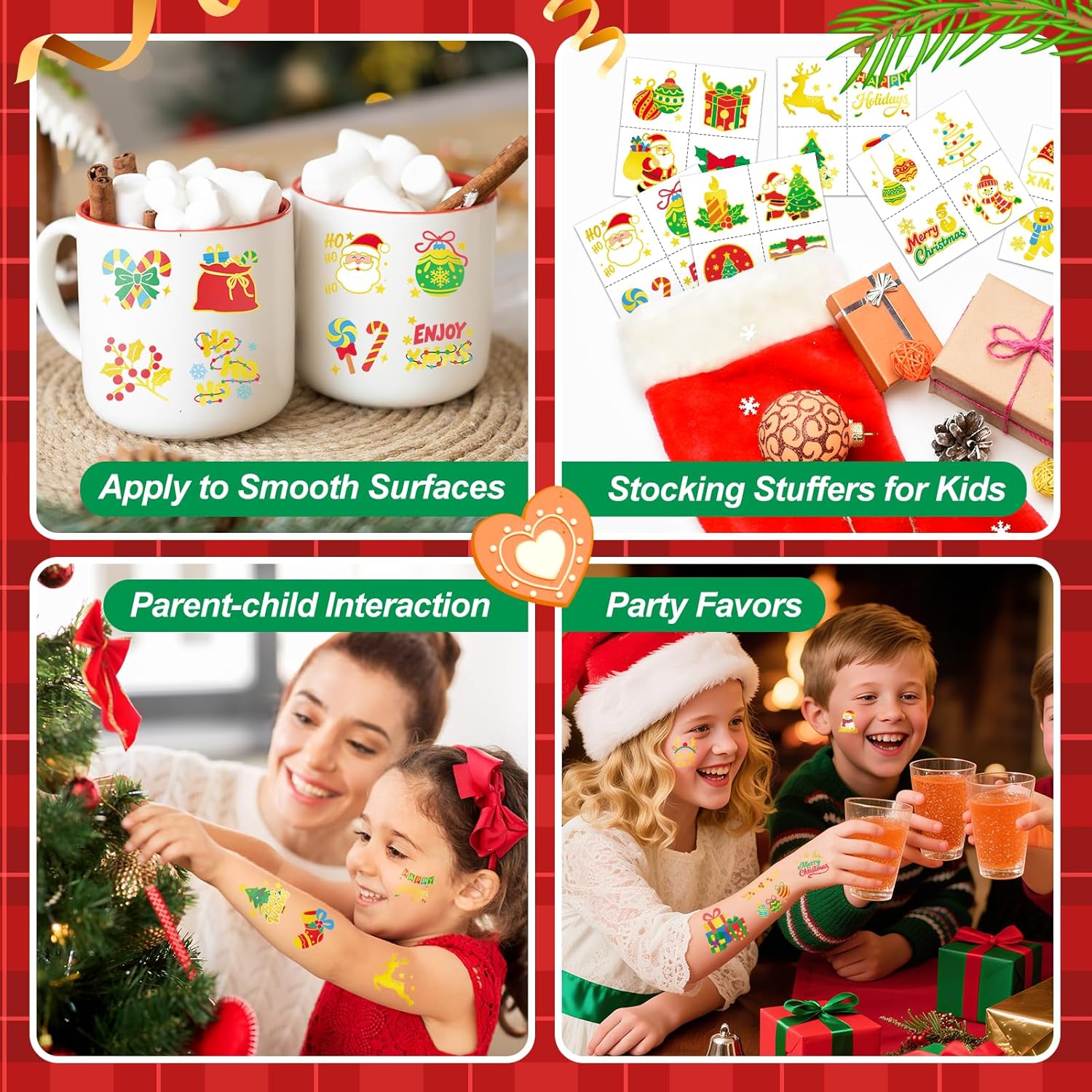 【Christmas Party Favors】Package includes 100 pcs metallic Christmas tattoos with a gift box(Attention: the gift box needs to be folded by yourself.) Featuring a variety of endearing and spocute Christmas-themed designs and bright colors, these tattoos are designed to delight and inspire. Create unforgettable memories this Christmas season as you and the kids revel in the joy of decorating together!