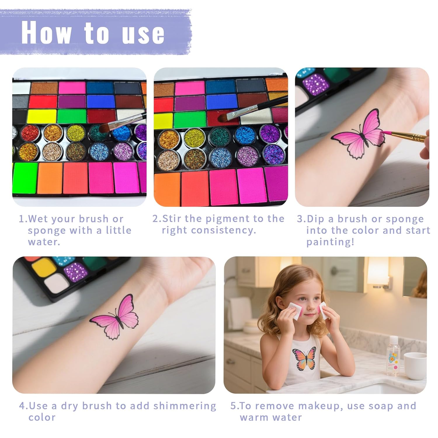 Easy Application & Quick Removal Face Painting Kit Professional: Water-activated formula dries quickly with intense pigmentation for long-lasting, high-coverage wear that resists fading or cracking. Not waterproof—easily washes off with just soap and water or wet wipes. No oily residues or harsh cleansers needed!