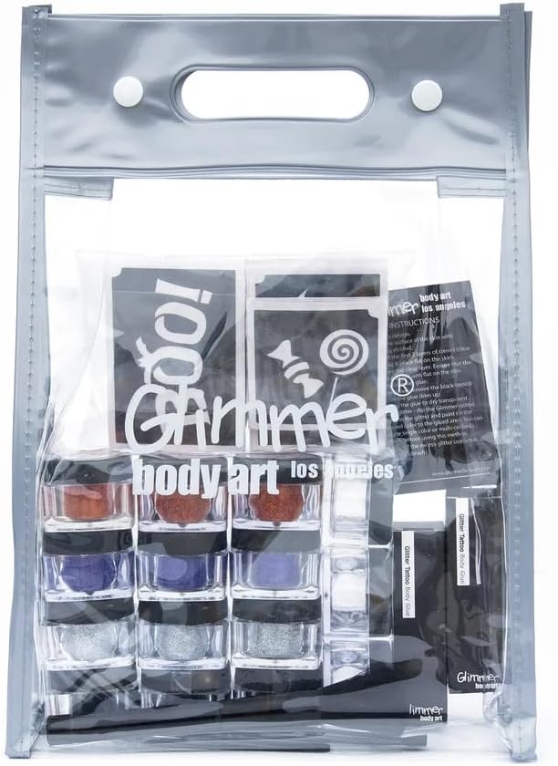 COMPLETE HALLOWEEN KIT: Contains 75 Halloween-themed stencils (15 designs, 5 each), 12 vibrant glitter colors in (plum, fire, black, silver), 3 crystal jars, 2 adhesive glues, 2 brushes, and tweezers