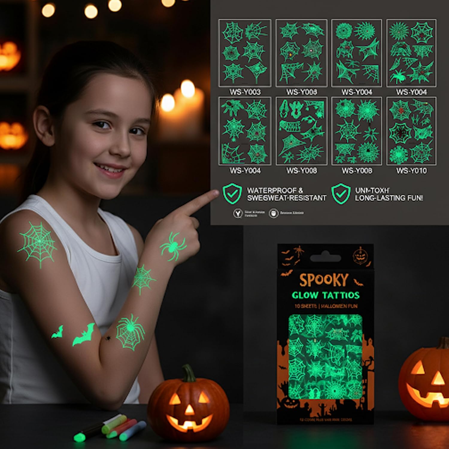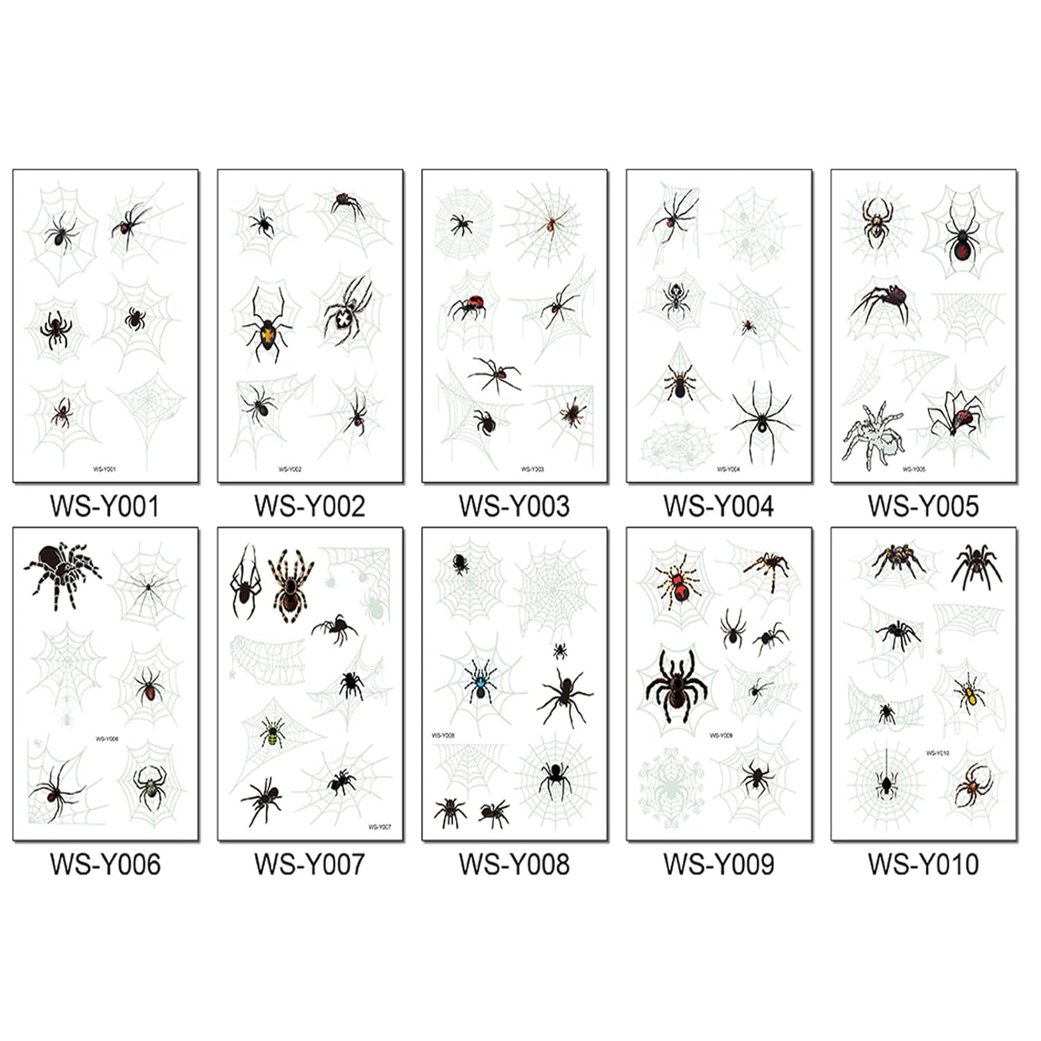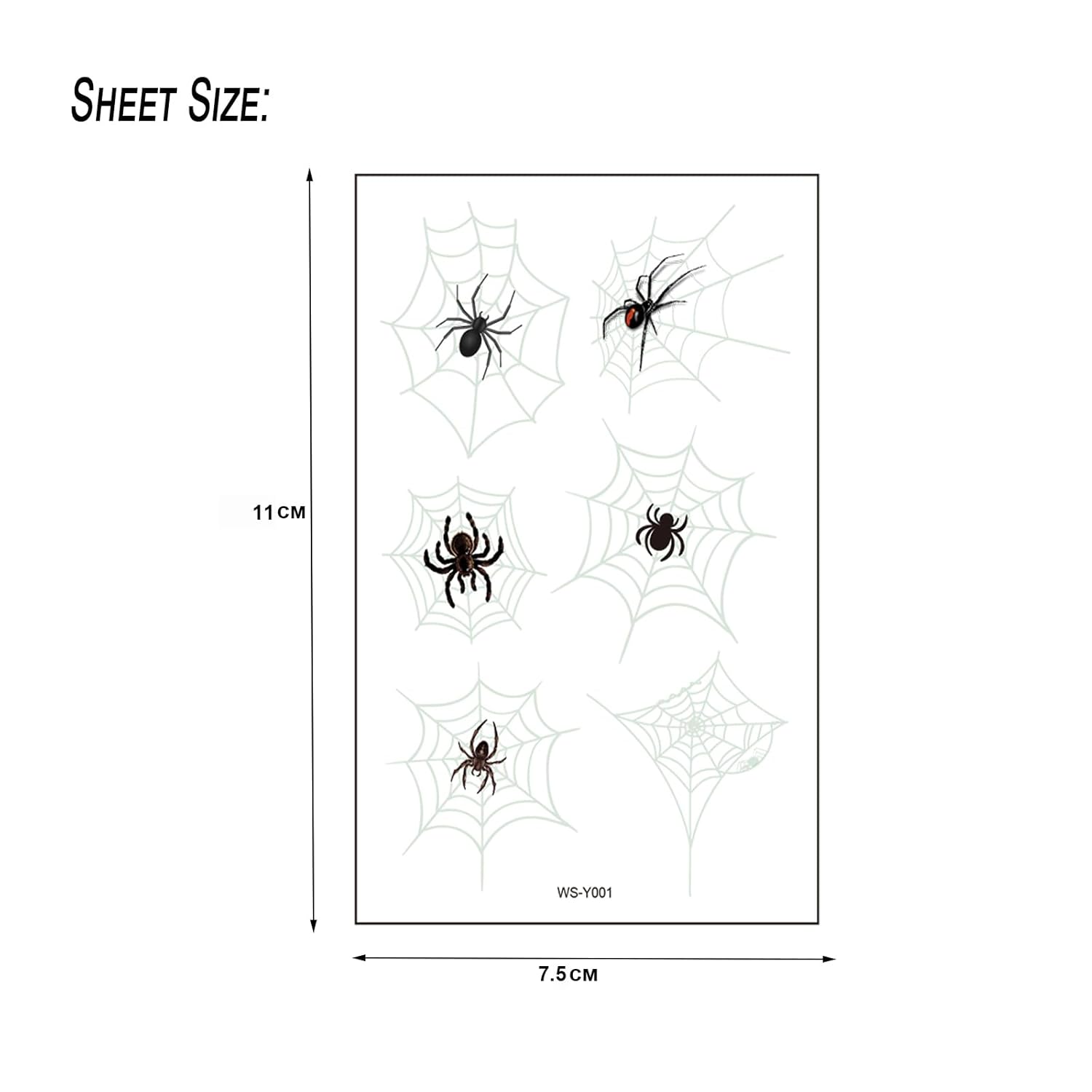 Quantity: Pack of 10 Sheets Luminous Spiders Halloween Temporary Tattoos; Size:11*7.5cm; With these Cute Stylish Halloween Theme Temporary Tattoos Glow in the Dark, Both Children and Adults can Get Great Fun