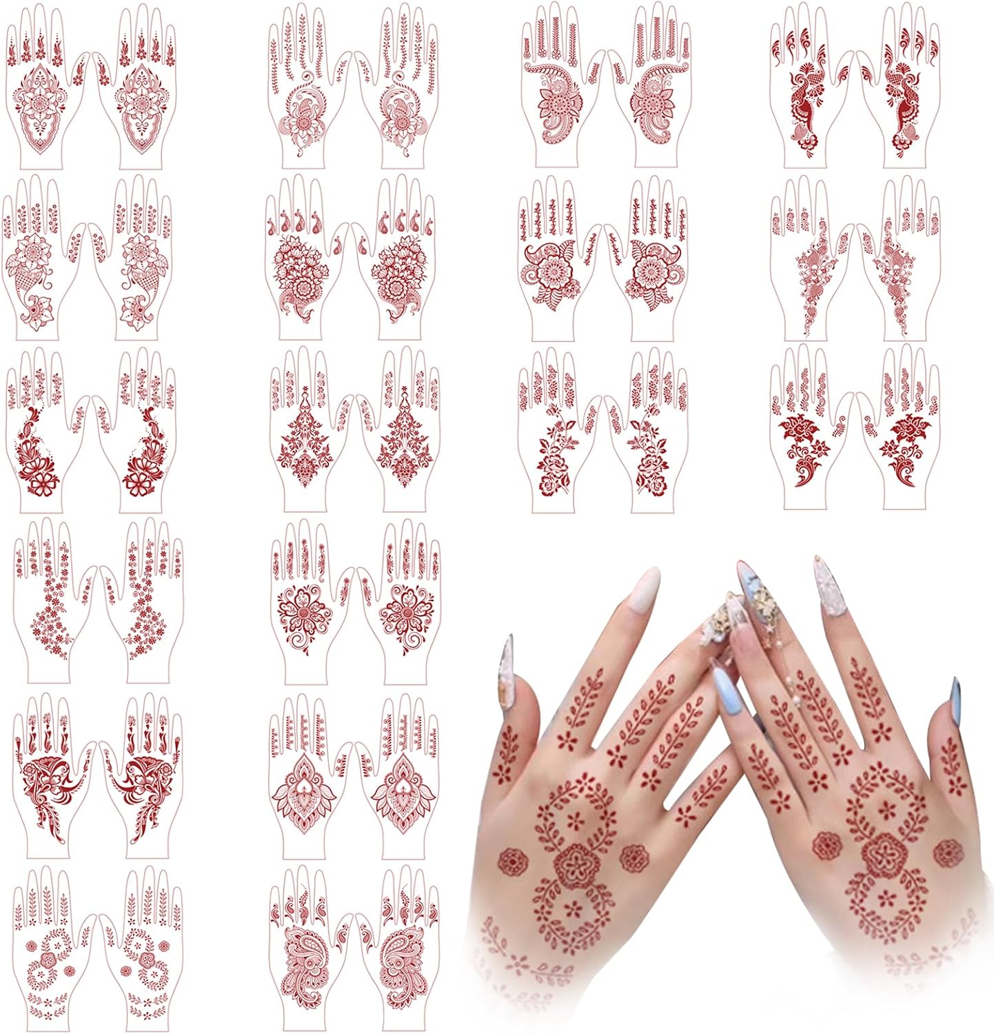18 Pairs: With 18 pairs of henna tattoo stickers in each pack, our henna tattoo stickers come in a variety of beautiful designs, including different floral patterns. Whether you prefer intricate details or bold, eye-catching designs, there's something for everyone in this pack.