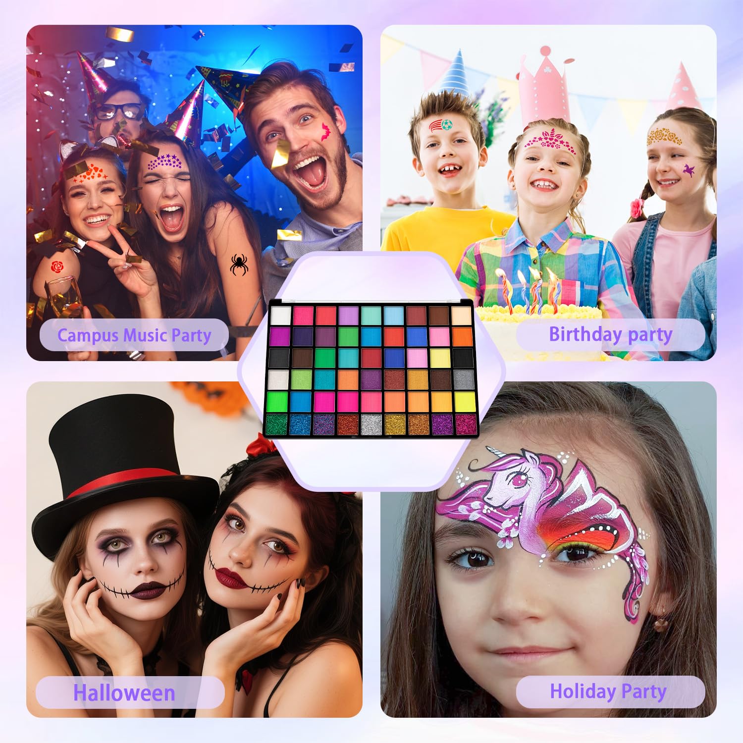 54 VIBRANT COLORS & PRO TOOLS: 54 colors of water-based face paints (36 matte shades, 9 glitter gels, 9 UV-glow paints), 6 Sheets/69 tattoo stencils, 6 reusable face painting stencils, 11 pcs painting brushes, 2 powder puffs,2 gem stickers, and face paint book. 54 Vibrant Colors & Pro Tools, perfect for Halloween raves, school carnivals, or superhero costumes.
